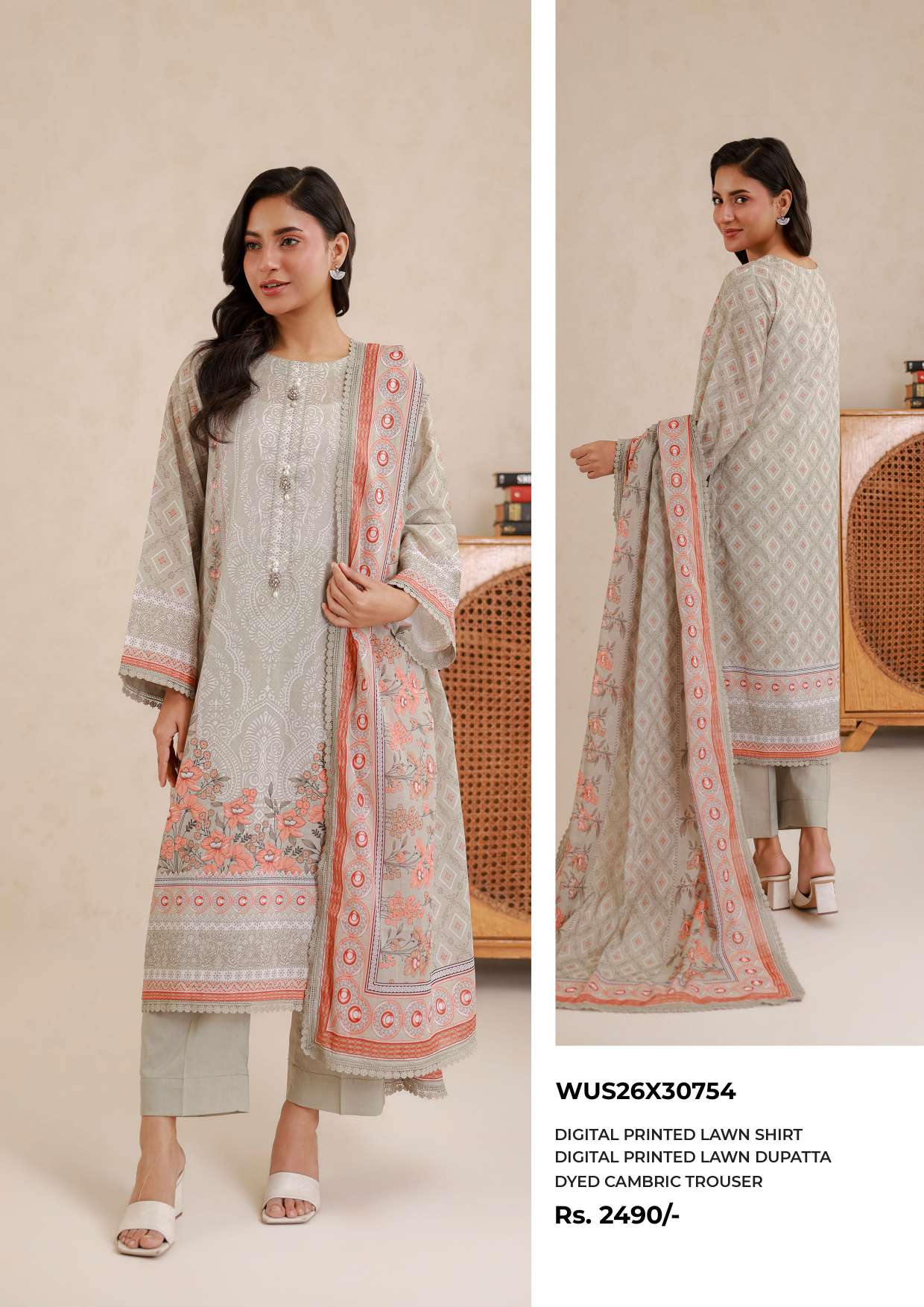 Is ke sath matching digital printed lawn dupatta diya gaya hai jo soft aur lightweight fabric ka bana hua hai, aur peach floral accents ke sath outfit ko ek fresh aur stylish touch deta hai. Dyed cambric trouser is suit ka perfect complement hai jo comfort aur durability dono provide karta hai.