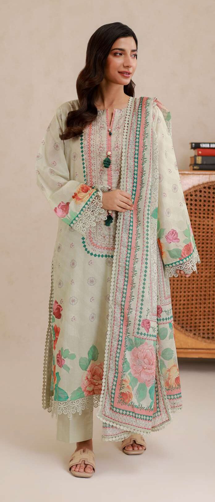 Is ke sath matching digital printed lawn dupatta diya gaya hai jo outfit ki overall beauty ko enhance karta hai. Dupatta ka design aur soft fabric aap ko ek graceful aur stylish appearance deta hai. Is ke ilawa dyed cambric trouser bhi included hai jo comfortable fitting aur simple elegance provide karta hai.