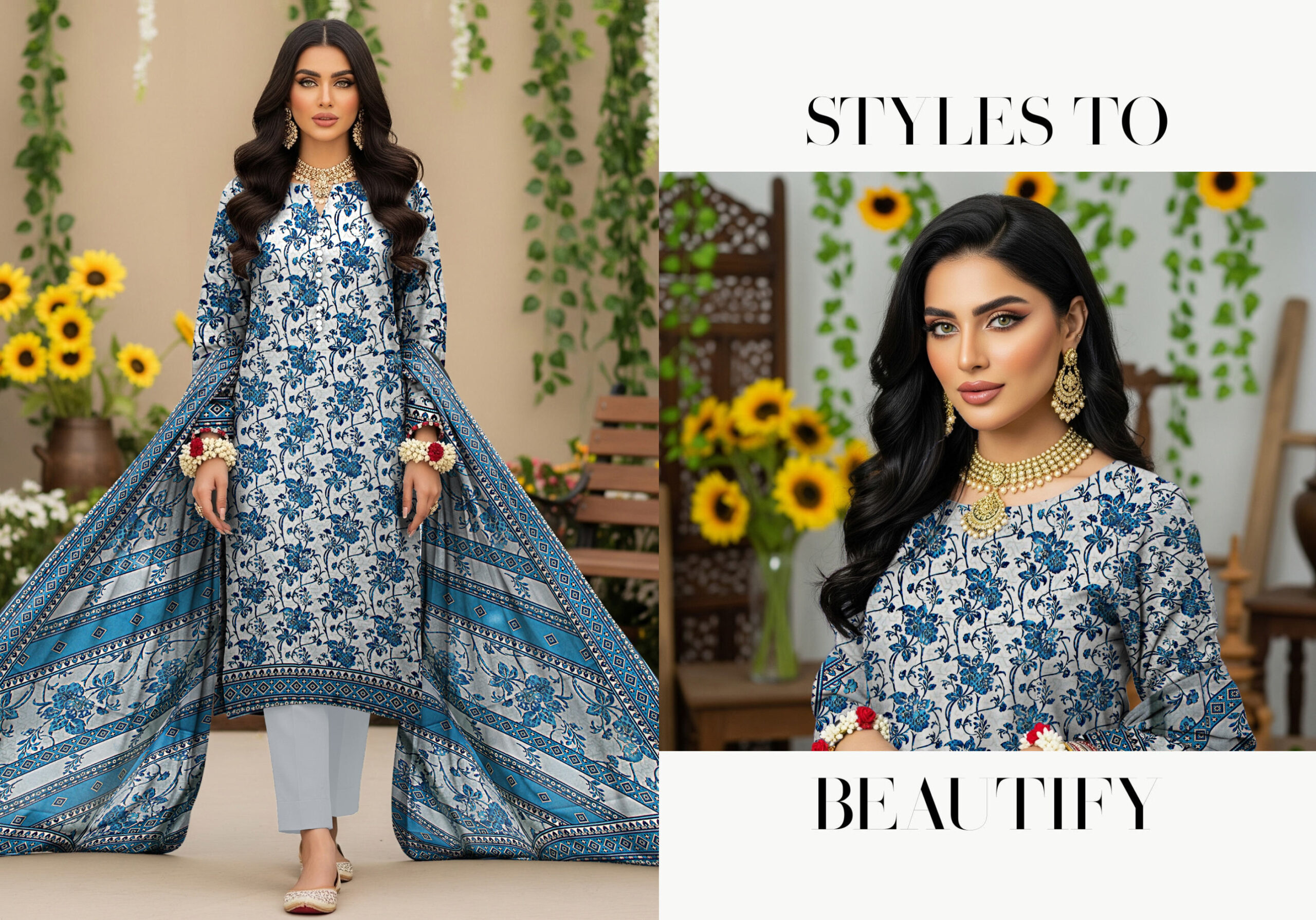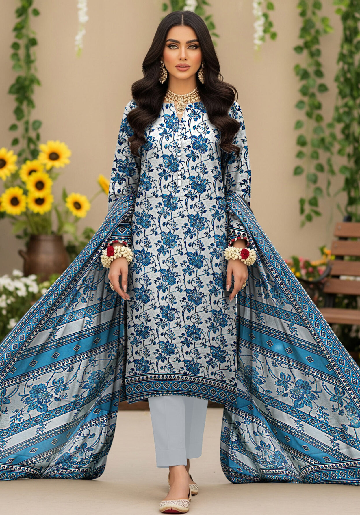 Is tasveer mein model BLUE BERRY ka elegant blue aur white floral printed 3 piece suit pehni hui hai. Shirt par delicate blue floral print hai jo bohat soft aur graceful look deta hai. Is ke sath matching printed dupatta hai jisme detailed border design diya gaya hai. Model ne traditional jewelry ke sath apni styling ko enhance kiya hai, jab ke background mein flowers aur greenery outfit ki freshness ko highlight karte hain.