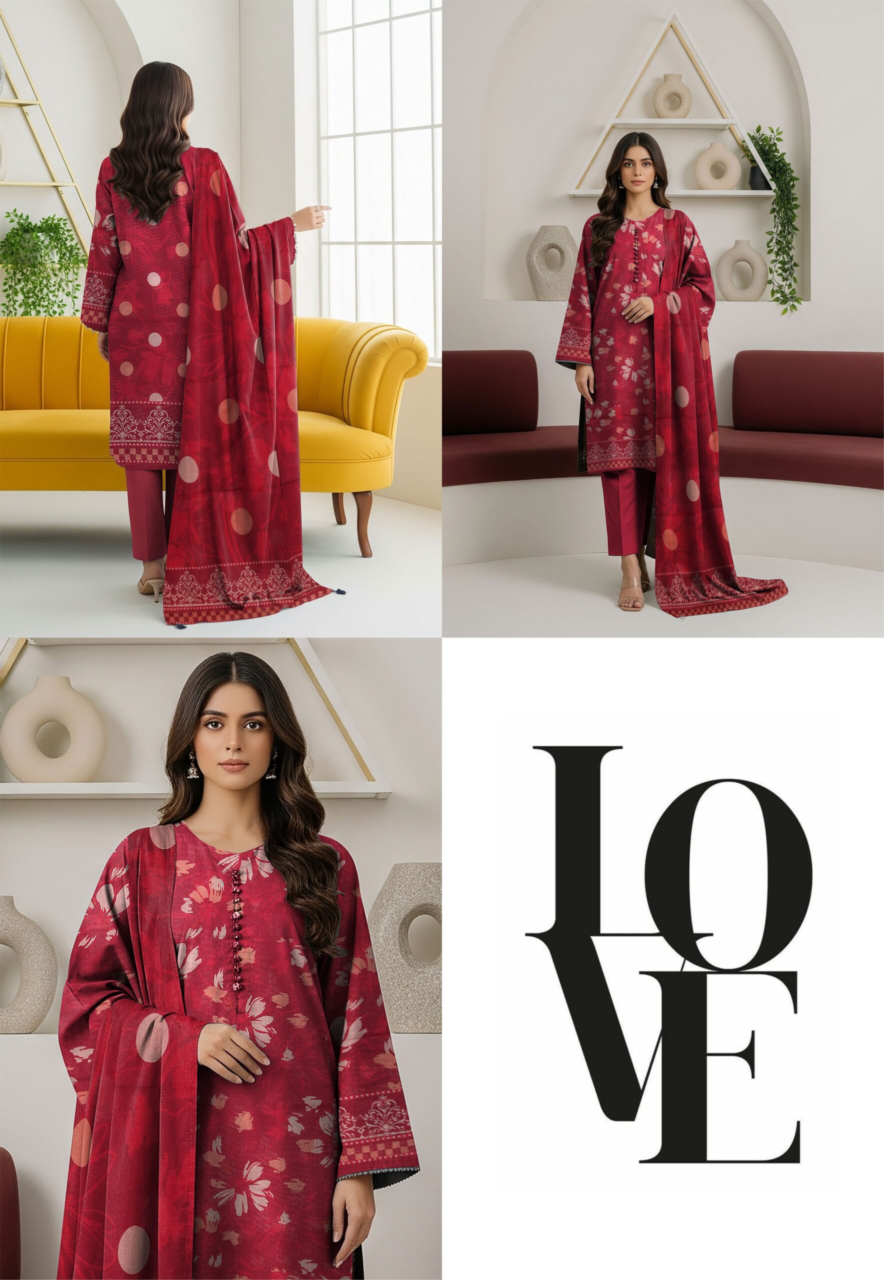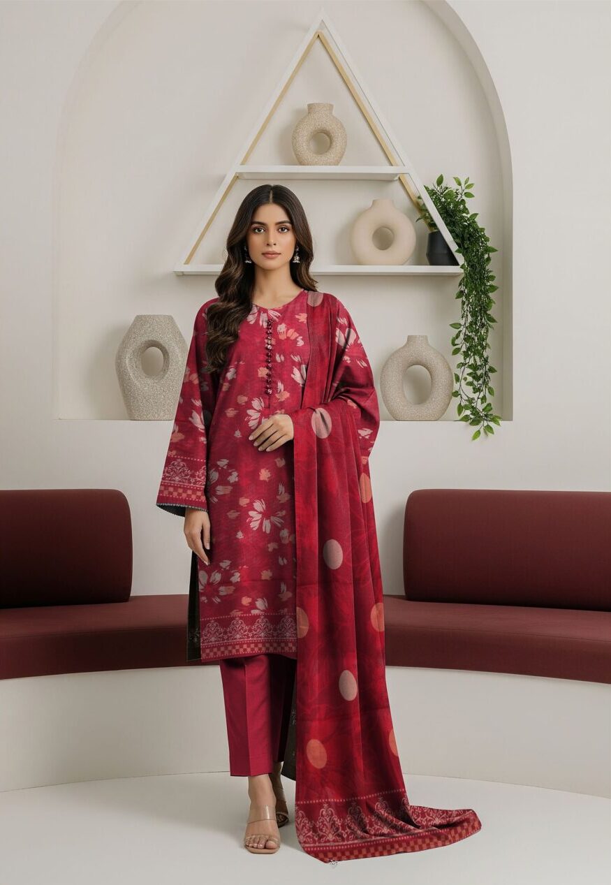 BLUE BERRY ka yeh khubsurat red 3 piece lawn suit un khawateen ke liye perfect hai jo apni dressing mein elegance aur style dono chahti hain. Is outfit ka deep red color ek classic aur timeless appeal rakhta hai jo har occasion ke liye suitable hai.