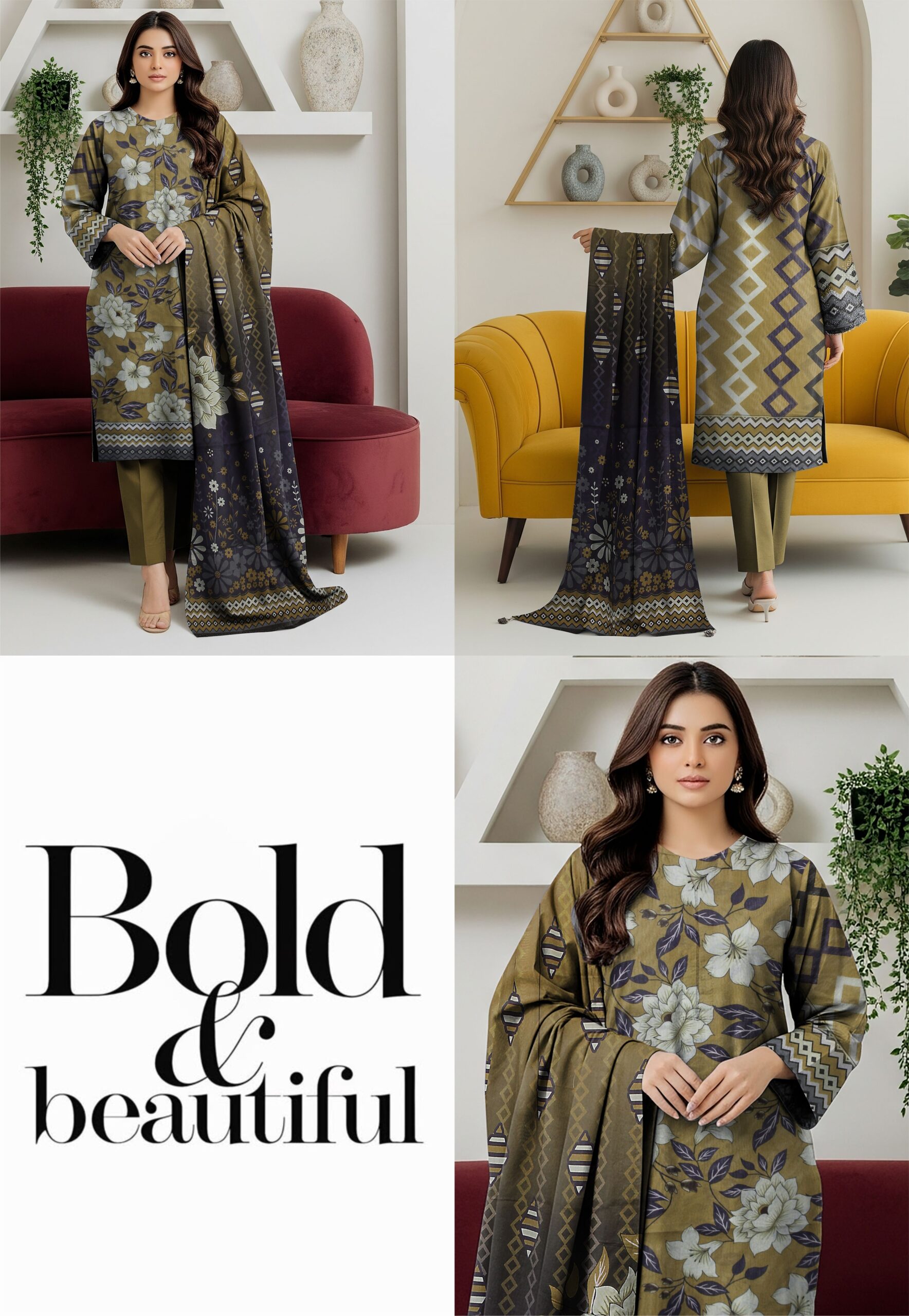 BLUE BERRY ka yeh olive green 3 piece lawn suit un khawateen ke liye design kiya gaya hai jo elegance aur comfort dono ko ek sath prefer karti hain. Is outfit ka floral print ek fresh aur natural look deta hai jab ke geometric patterns isay modern touch dete hain. High-quality lawn fabric garmiyon ke liye ideal hai, jo halka, breathable aur comfortable feel deta hai.