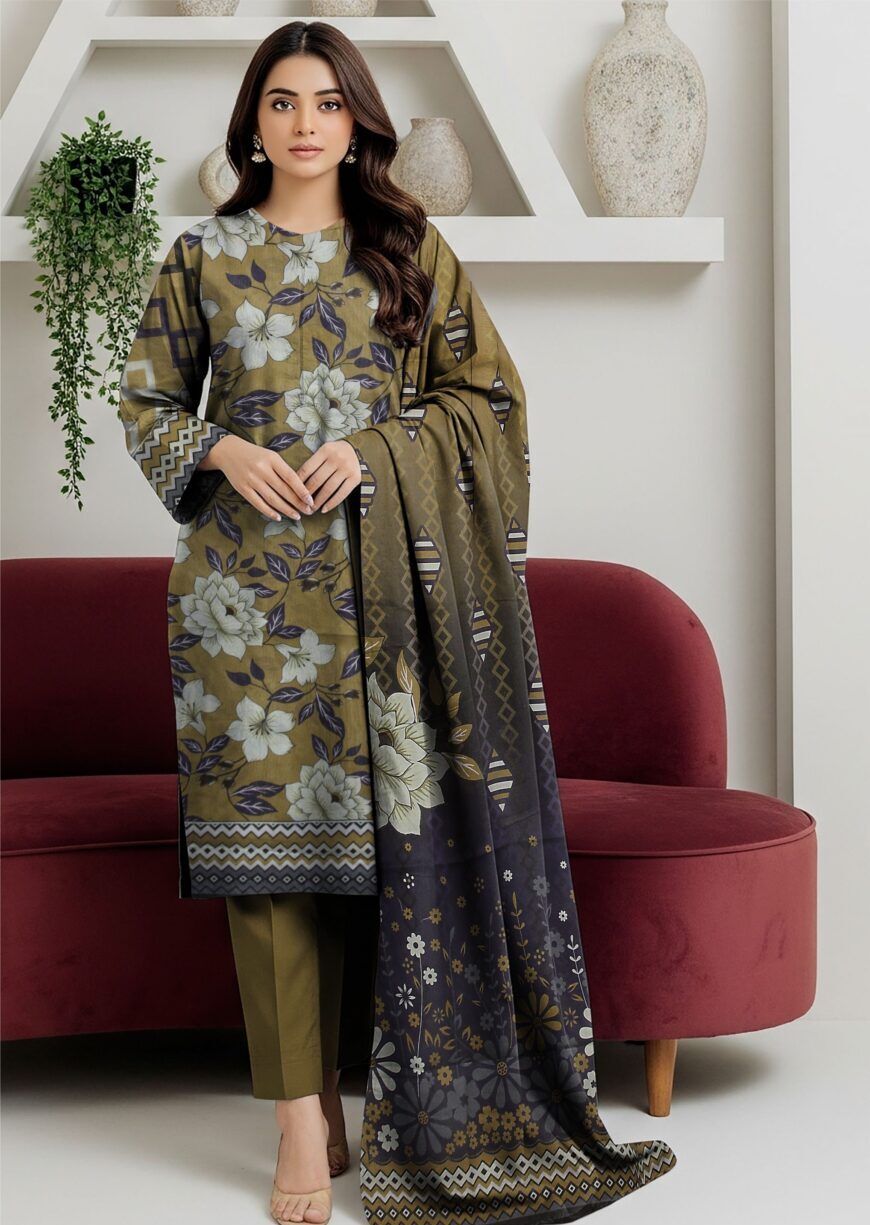BLUE BERRY Olive Green Floral Printed 3 Piece Lawn Suit for Women with Dupatta – Elegant Summer Collection