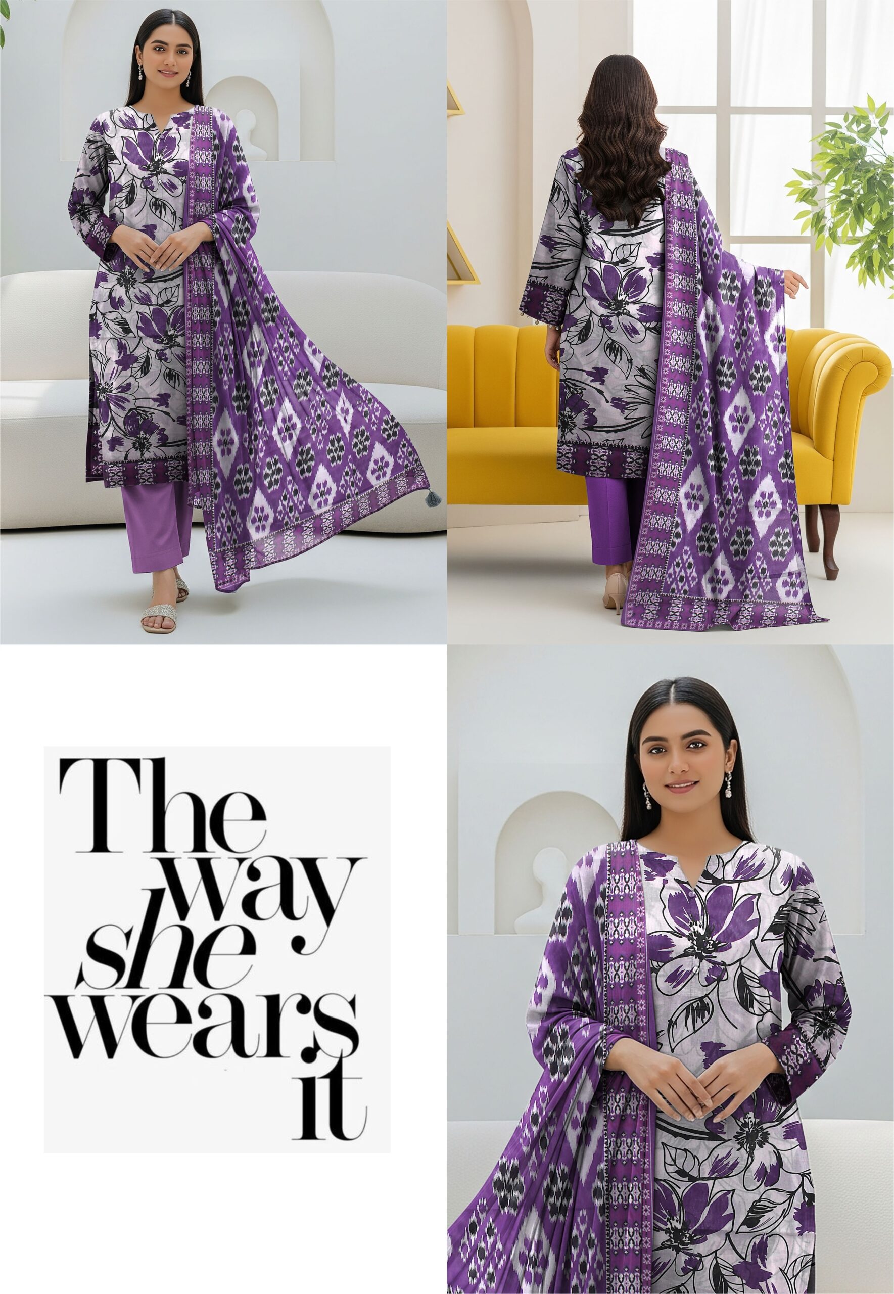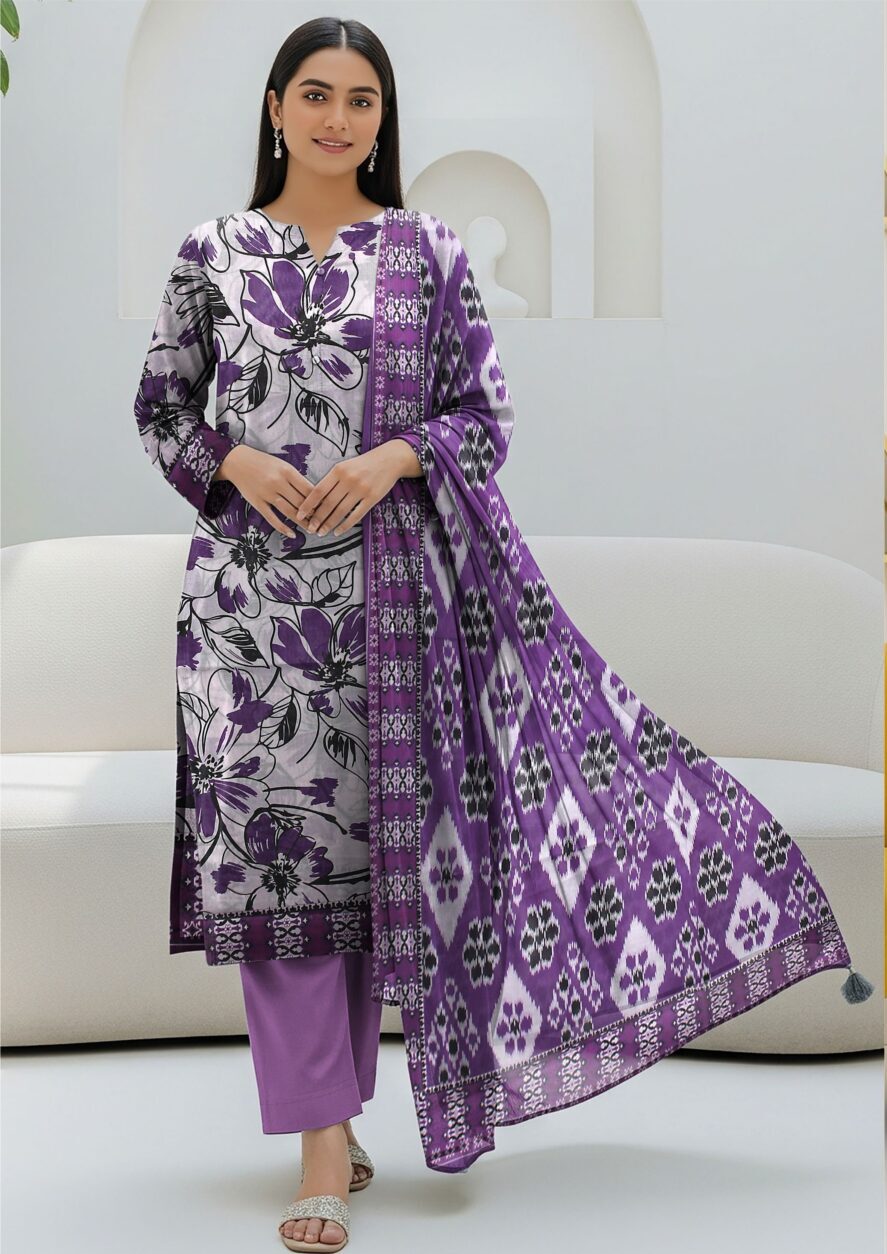BLUE BERRY ka yeh elegant purple floral 3 piece lawn suit un khawateen ke liye perfect hai jo apni daily aur semi-formal dressing mein style aur comfort dono chahti hain. Is outfit ka purple aur white color combination fresh aur eye-catching hai jo har season mein aapko standout look deta hai.