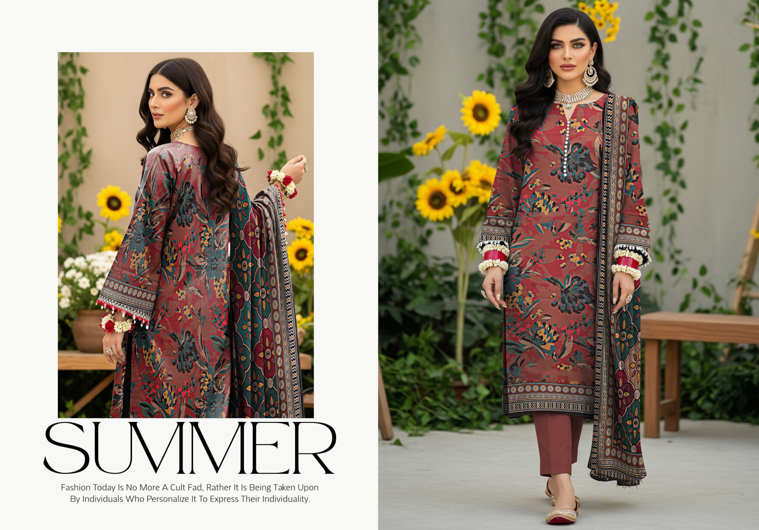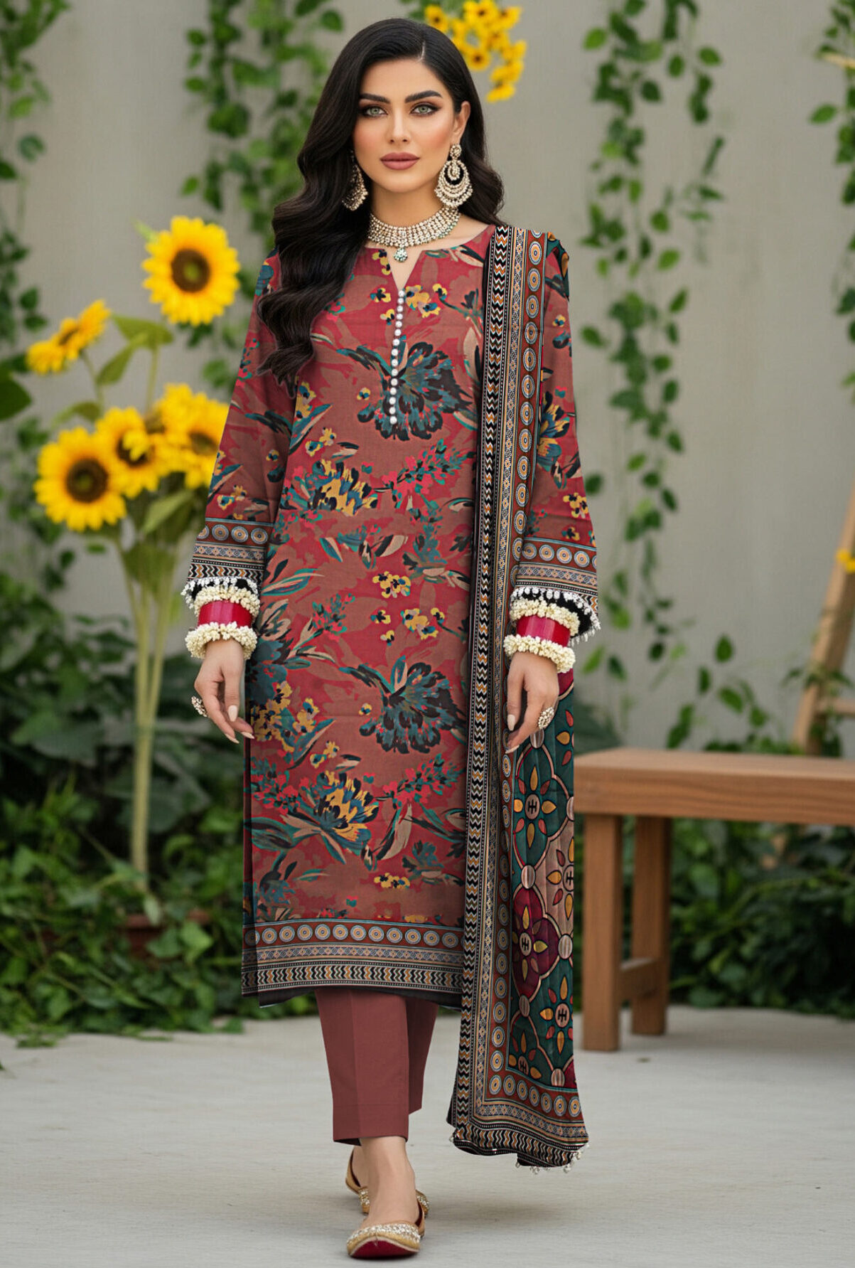 Is tasveer mein model BLUE BERRY ka khubsurat rust color ka floral printed 3 piece suit pehni hui hai. Shirt par multi-color floral design hai jo isay unique aur eye-catching banata hai. Is ke sath matching printed dupatta diya gaya hai jisme intricate patterns hain. Model ne traditional jewelry ke sath apni look ko complete kiya hai, jab ke background mein phool aur greenery outfit ki summer vibe ko enhance karte hain.
