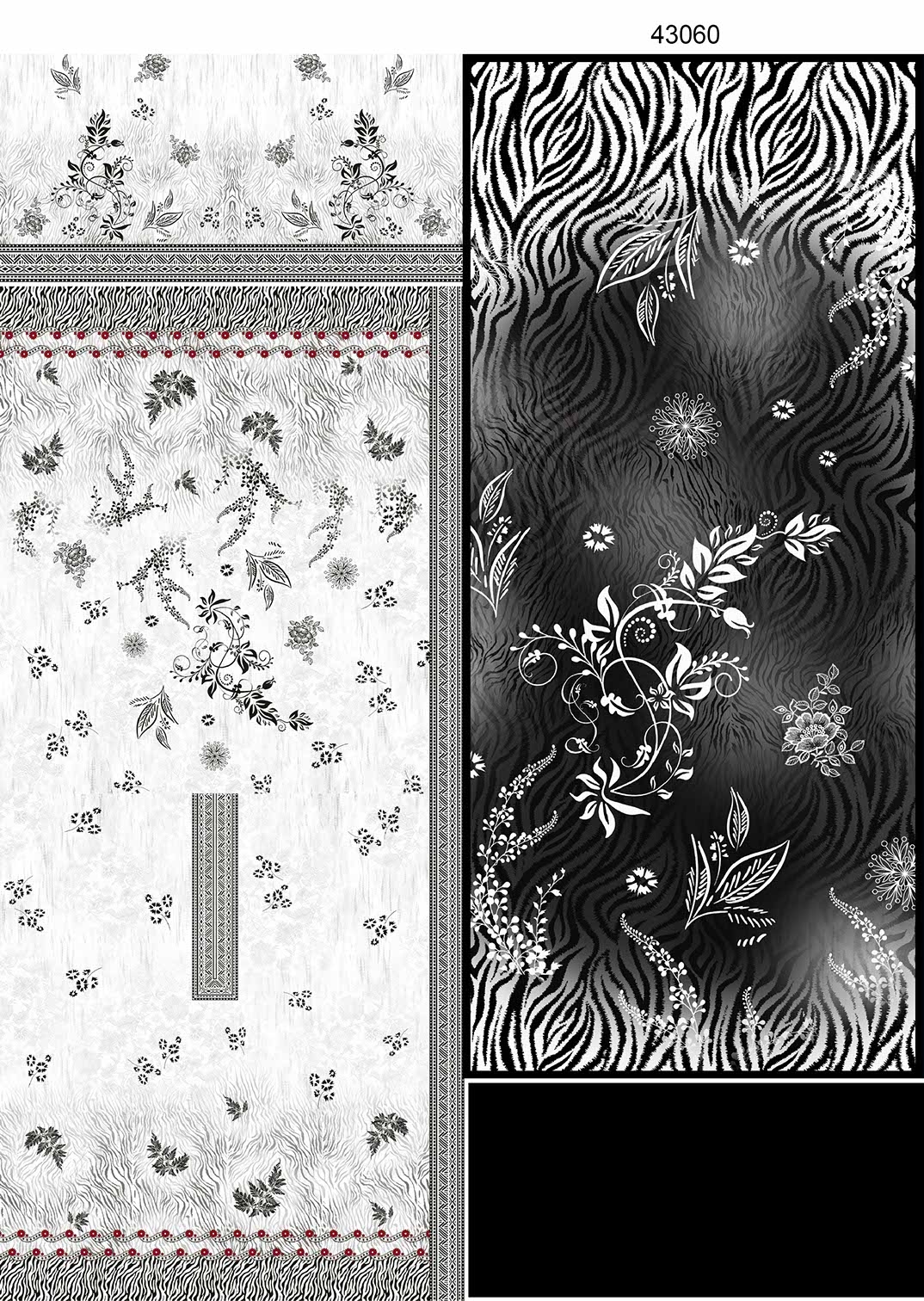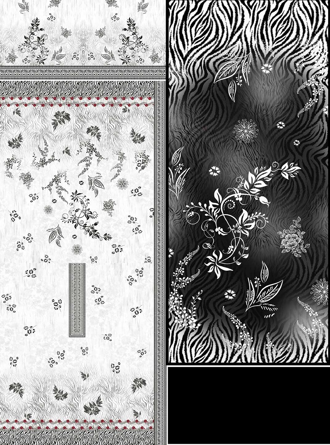 Is suit ka highlight iska bold black dupatta hai jismein abstract zebra-style pattern ke sath floral elements combine kiye gaye hain, jo outfit ko ek unique aur trendy touch deta hai. Plain black trouser poore suit ko balance karta hai aur ek sophisticated finishing deta hai.