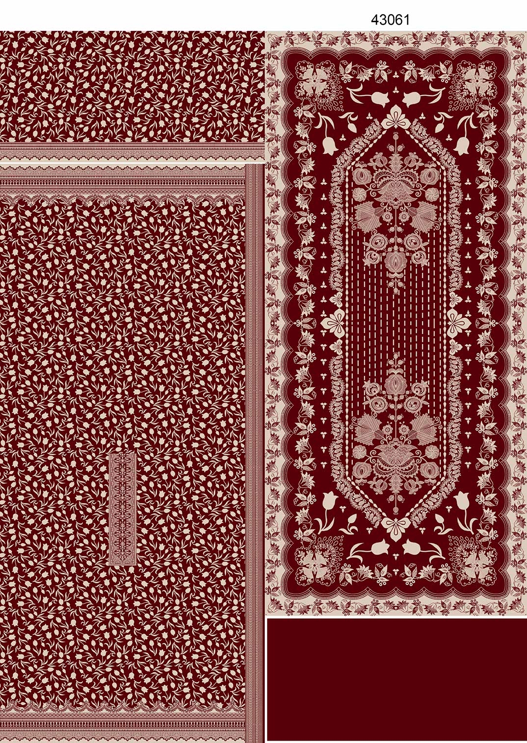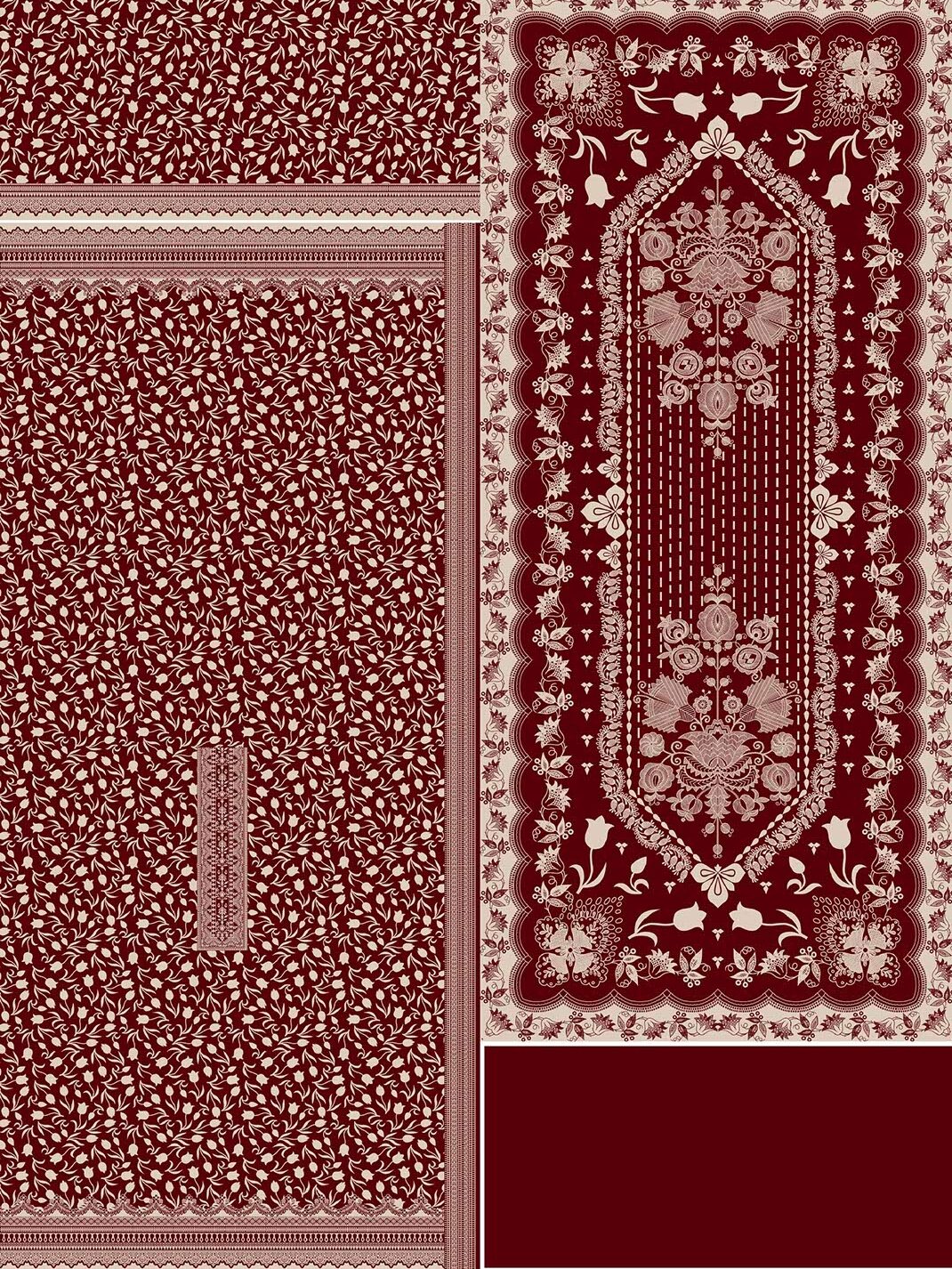 Dupatta is outfit ka main attraction hai jismein traditional pattern aur intricate borders ke sath detailed design diya gaya hai. Iska symmetrical layout aur classic motifs poore suit ko ek royal aur premium feel dete hain. Plain maroon trouser is combination ko perfect balance deta hai aur ek clean finishing provide karta hai.