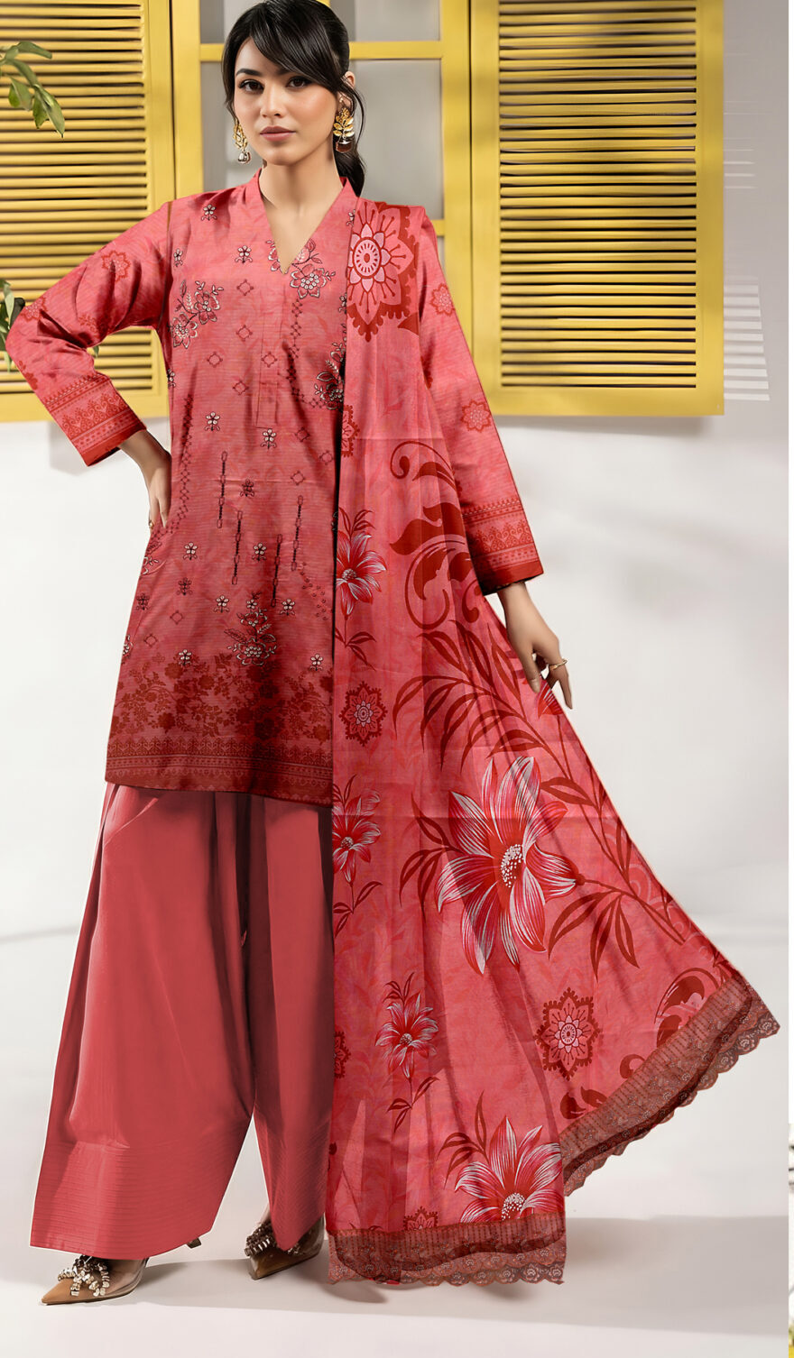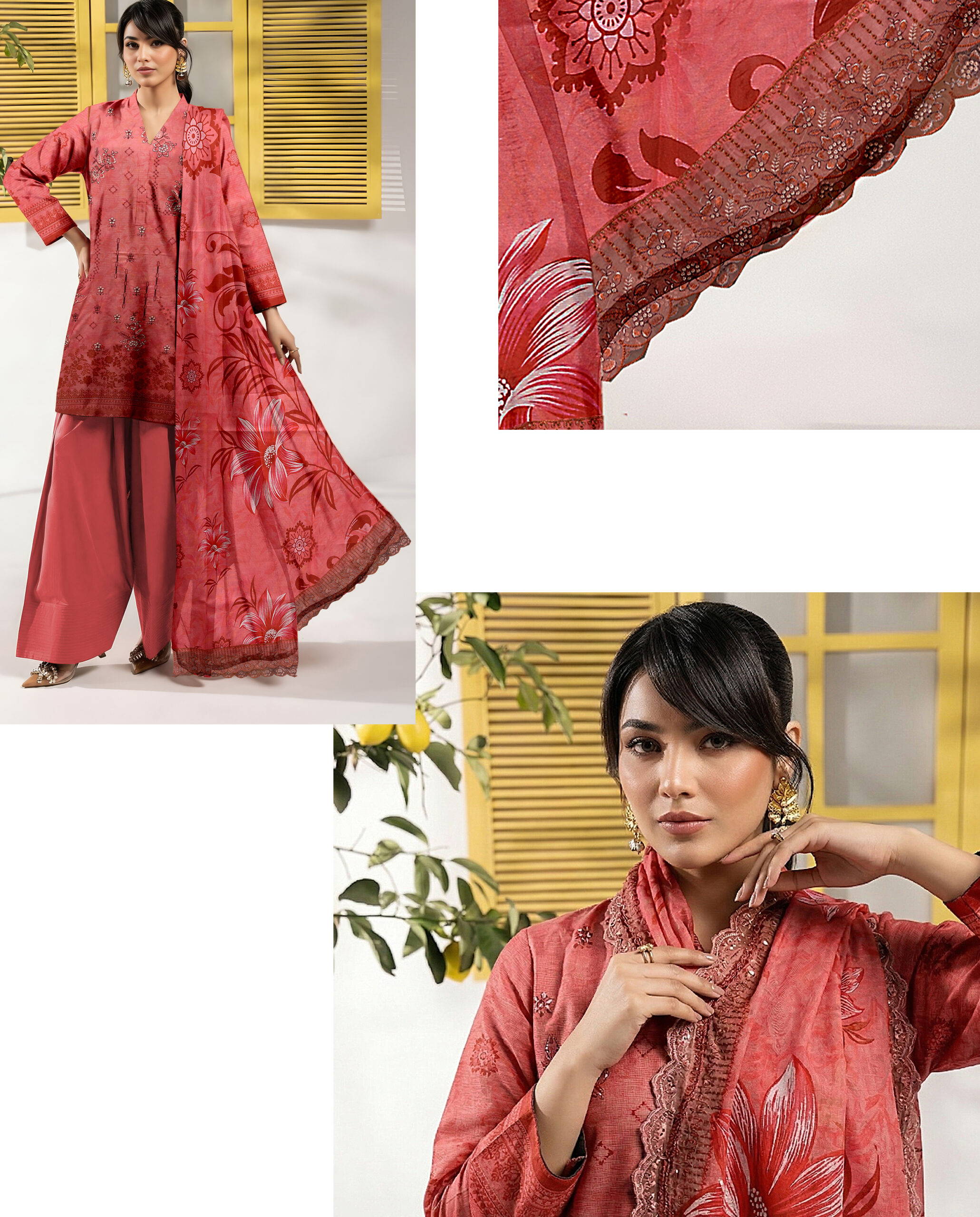 HT brand ka yeh coral pink floral printed lawn suit un khawateen ke liye design kiya gaya hai jo halka, stylish aur comfortable summer outfit talash kar rahi hain. Is 3-piece suit mein premium quality lawn fabric use hua hai jo garm mosam mein airy aur breathable feel deta hai.