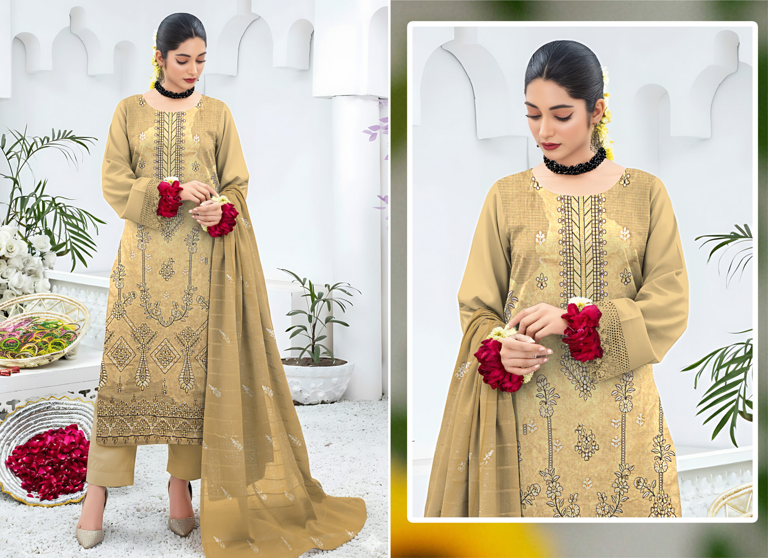HT brand apni quality aur modern traditional designs ke liye mashhoor hai, aur yeh suit bhi usi standard ka ek behtareen example hai. Agar aap ek graceful, comfortable aur stylish outfit dhoond rahi hain, to yeh mustard gold suit aap ke wardrobe ke liye perfect choice hai.