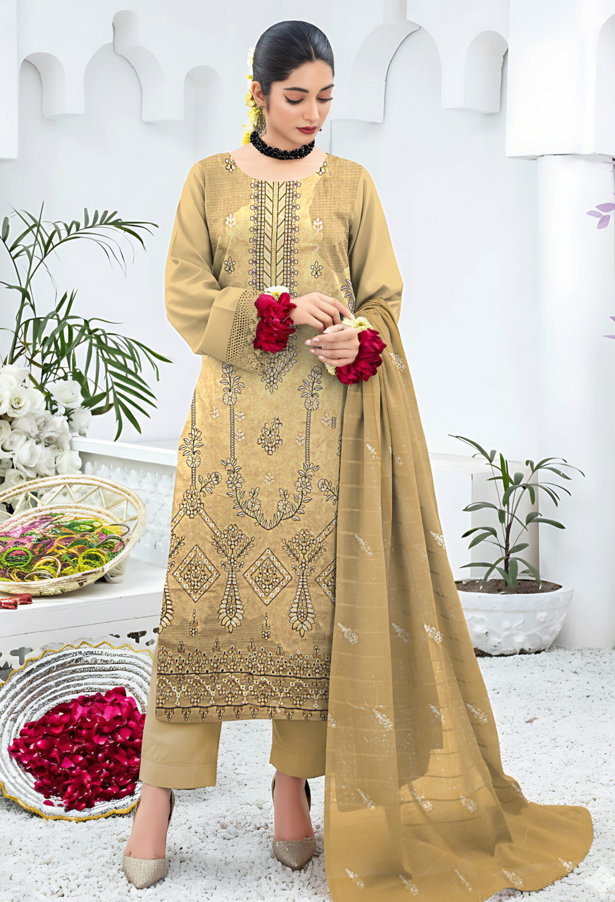 Is suit ke sath matching plain trouser diya gaya hai jo embroidered shirt ke sath perfectly balance create karta hai. Iska chiffon dupatta halka aur airy hai, jisme subtle detailing overall look ko aur enhance karti hai. Yeh outfit aap formal gatherings, family events, aur festive occasions par asaani se carry kar sakti hain.