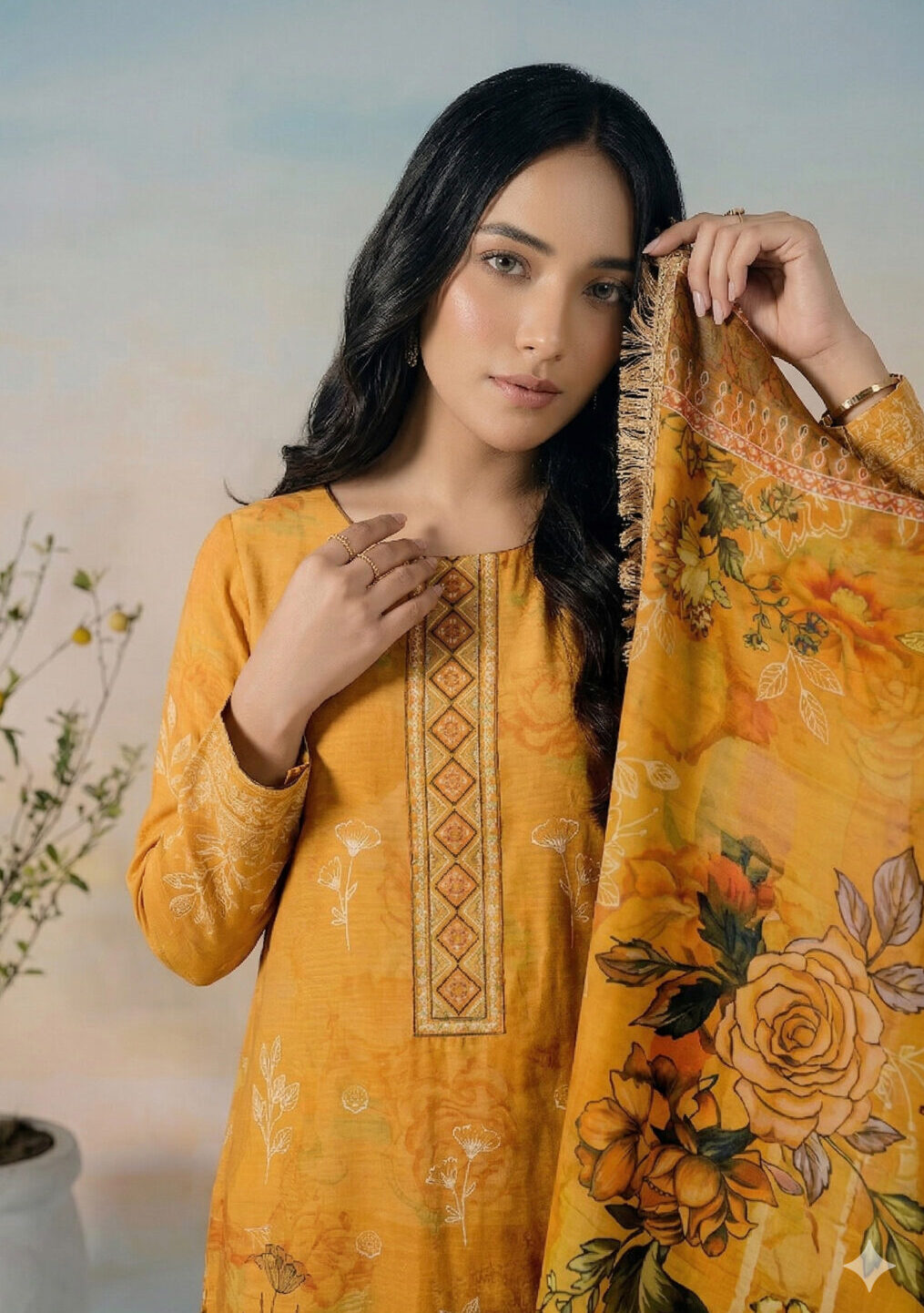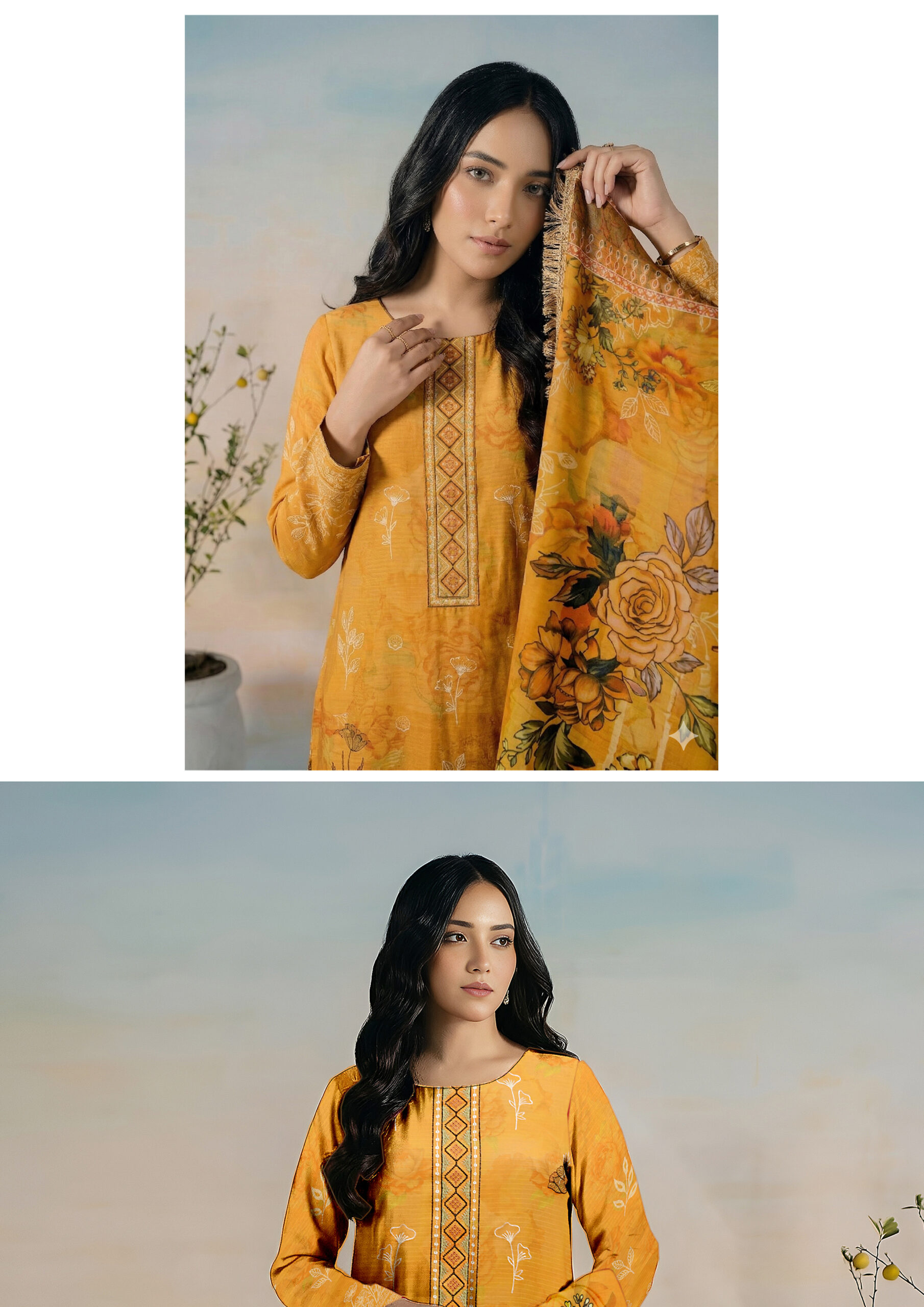 T brand ka yeh mustard yellow floral printed lawn suit un khawateen ke liye perfect hai jo simplicity ke sath elegance pasand karti hain. Is outfit mein high-quality lawn fabric use kiya gaya hai jo garmiyon ke liye lightweight, breathable aur comfortable hai.