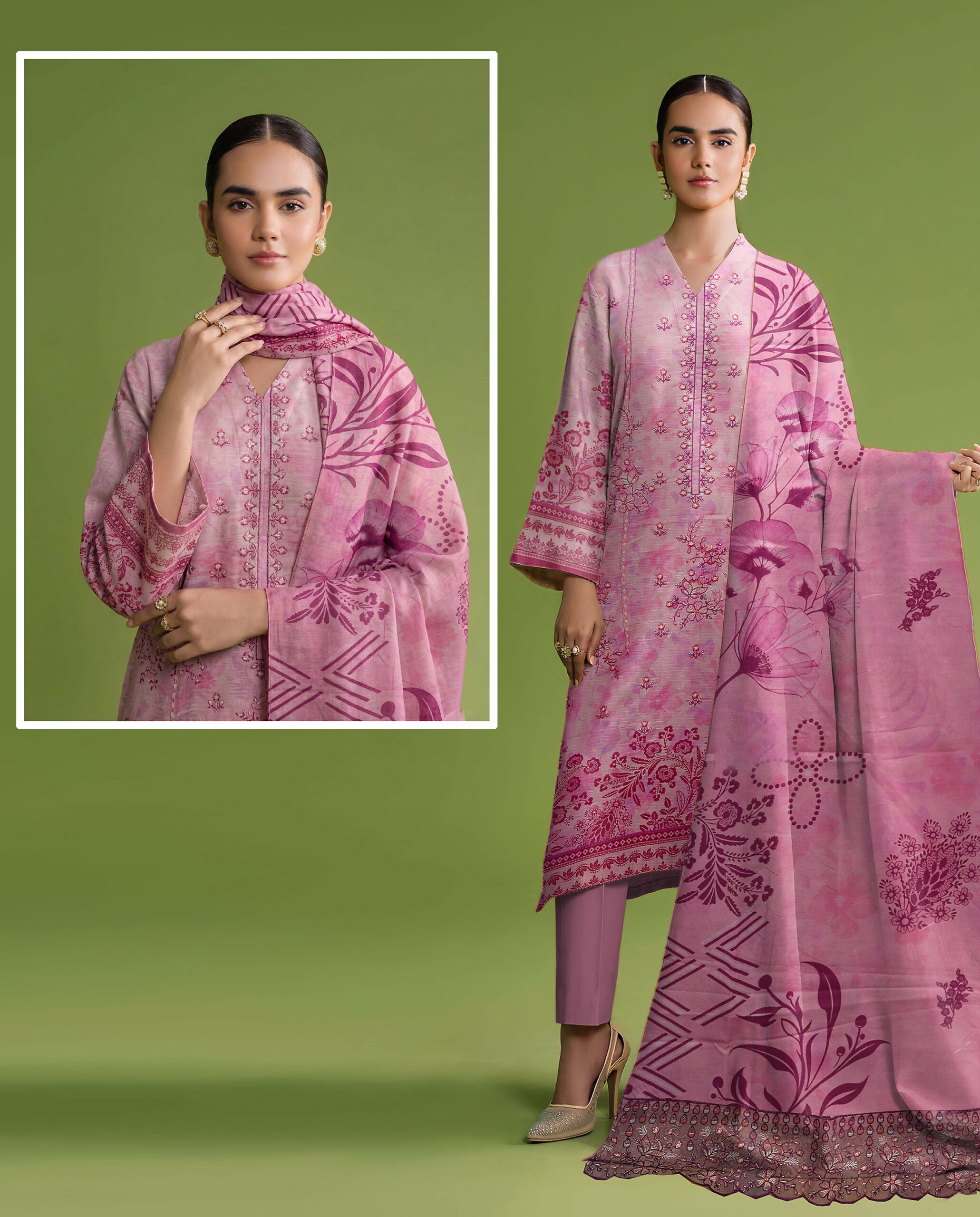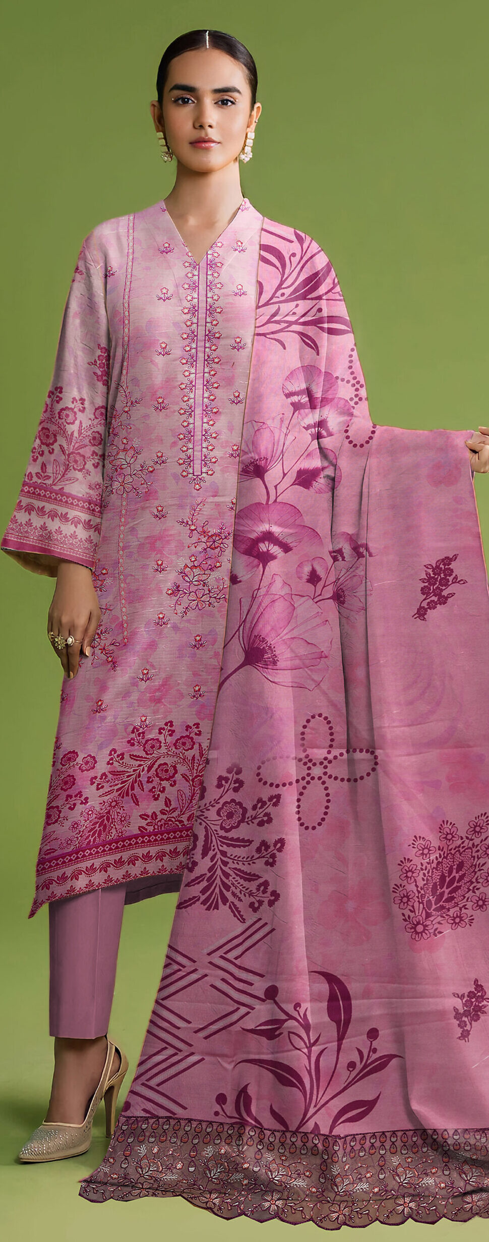 Is 3 piece suit ke sath matching trouser aur ek beautifully printed dupatta diya gaya hai jo outfit ki overall beauty ko enhance karta hai. Dupatta par detailed patterns aur border finishing isay aur bhi attractive banati hai. Fabric lightweight aur breathable hai jo garmi ke mosam mein comfortable feel deta hai.