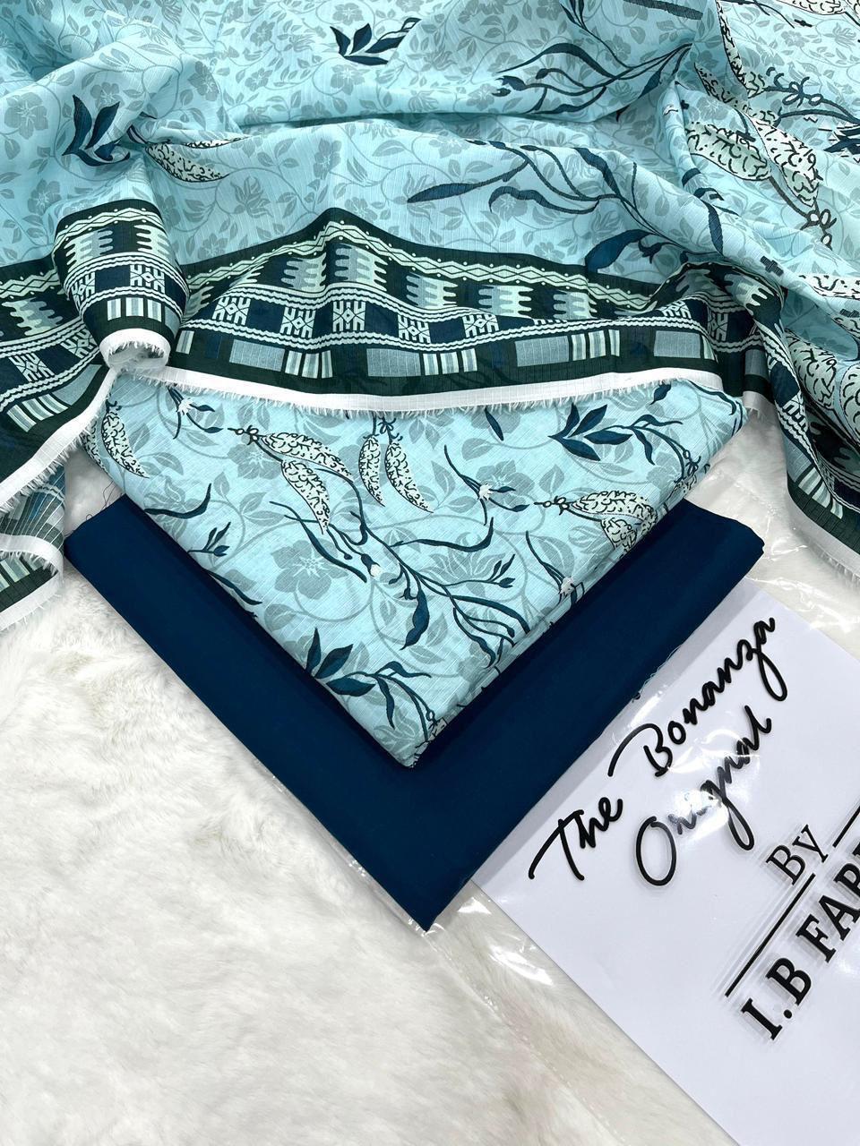 Is tasveer mein IB Print ka elegant 3 piece unstitched lawn suit dikhaya gaya hai jismein aqua blue base par soft floral print shirt, matching printed dupatta aur plain dark blue trouser shamil hai. Dupatta ke border par geometric pattern isay aur bhi stylish aur classy look deta hai.