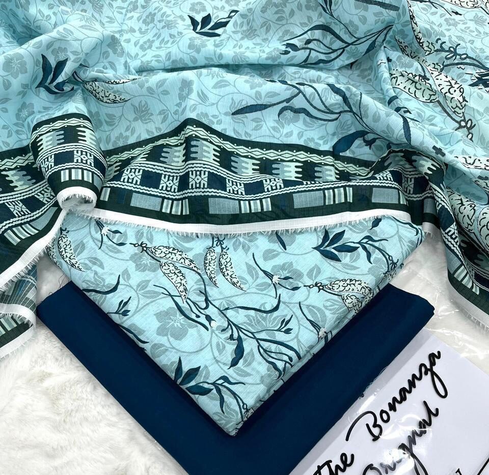 Yeh 3 piece unstitched suit high-quality lawn fabric se tayar kiya gaya hai jo lightweight, breathable aur garmiyon ke liye best choice hai. Iska soft aur smooth texture pehnay mein bohat comfortable hai aur din bhar cool feel deta hai. Dupatta par detailed border design outfit ko ek premium touch deta hai, jabke plain dark blue trouser isay balanced aur neat finishing deta hai.