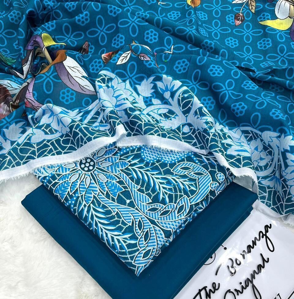 IB Print ka yeh khoobsurat blue lawn suit un logon ke liye perfect hai jo vibrant aur fresh colors pasand karte hain. Iska deep teal base aur us par bana floral pattern ek soothing aur classy feel deta hai. Dupatta par light blue aur white shades ke sath intricate design aur border is outfit ko aur bhi attractive bana deta hai.