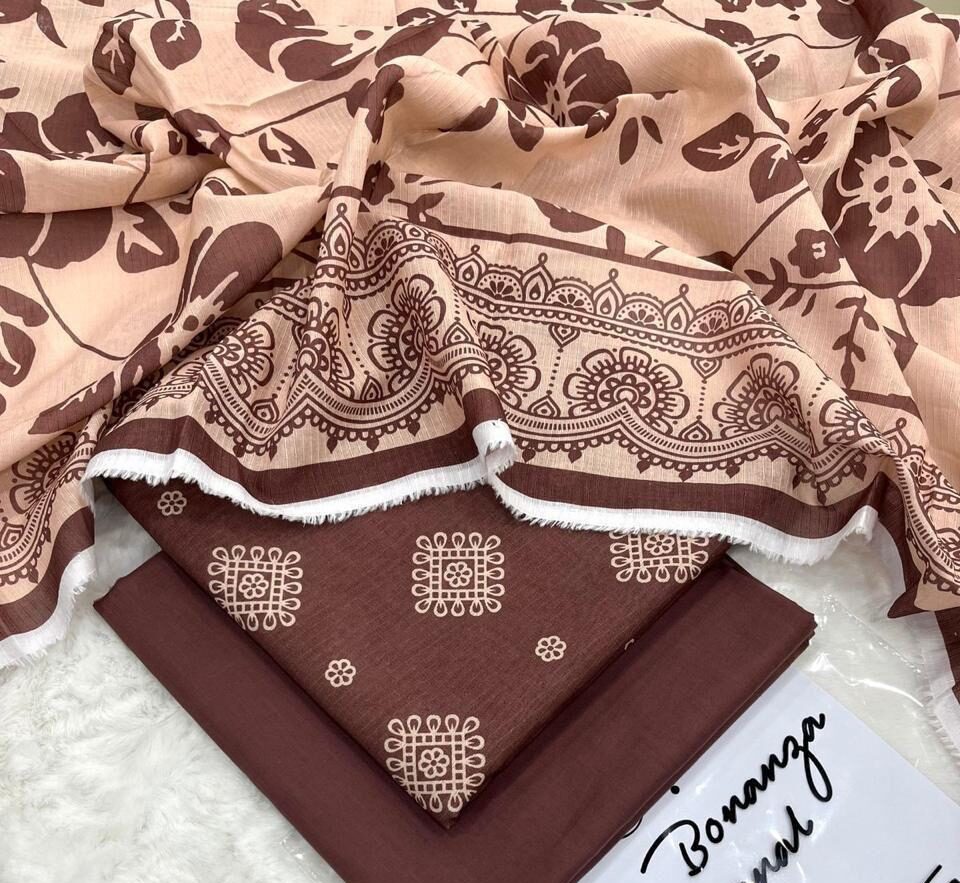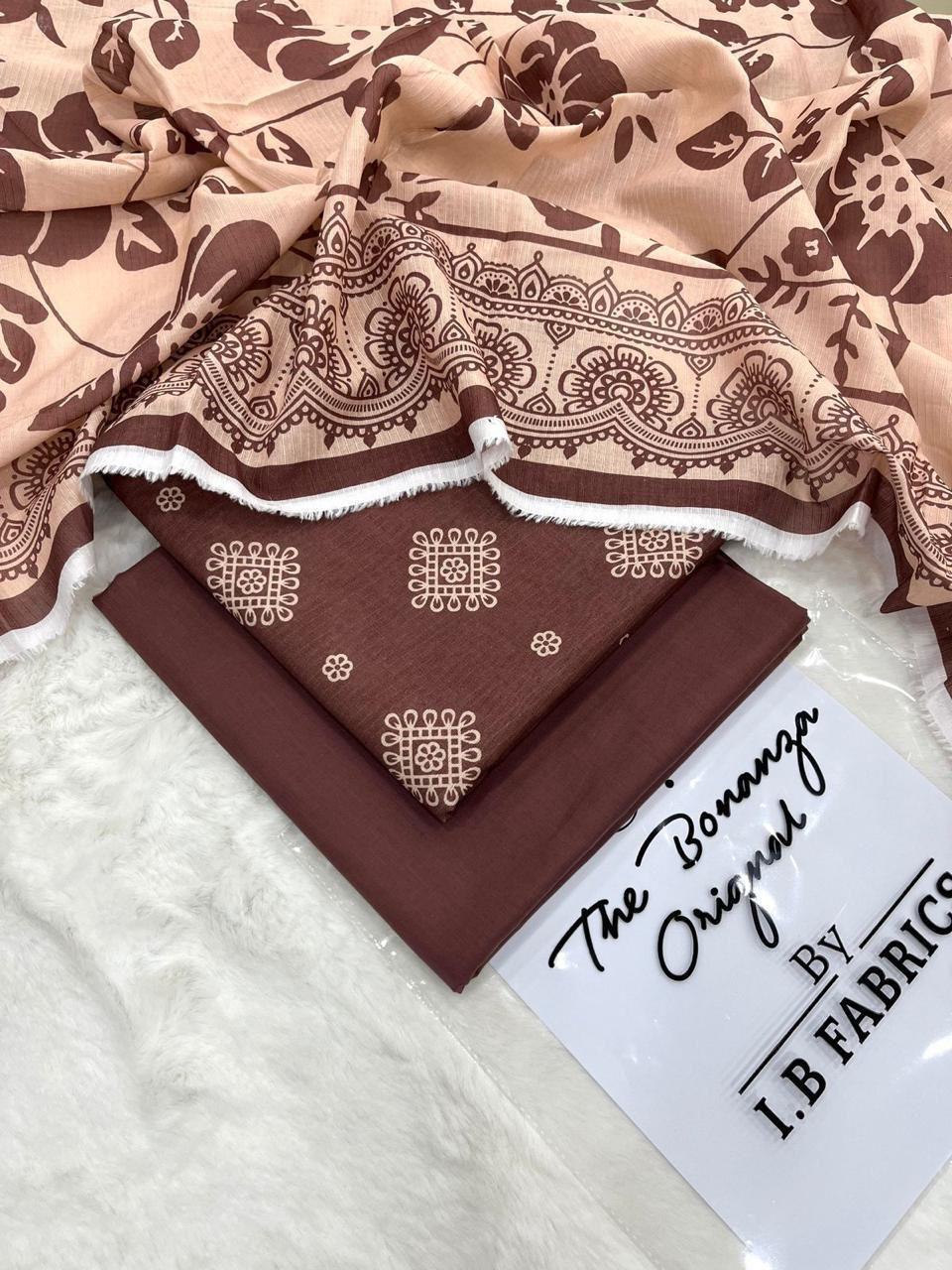 IB Print Brown & Beige Floral Unstitched Lawn Suit for Women – Elegant Summer 3 Piece Collection