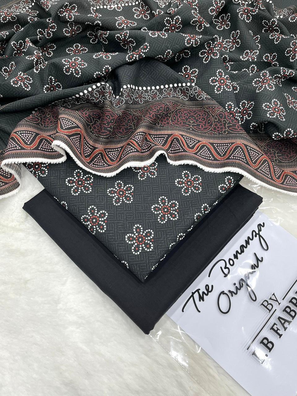 IB Print apni stylish summer collection mein ek aur sophisticated unstitched lawn suit introduce karta hai jo charcoal black shade ke sath subtle floral prints ka khoobsurat combination pesh karta hai. Yeh outfit un logon ke liye perfect hai jo dark tones aur graceful designs pasand karte hain.