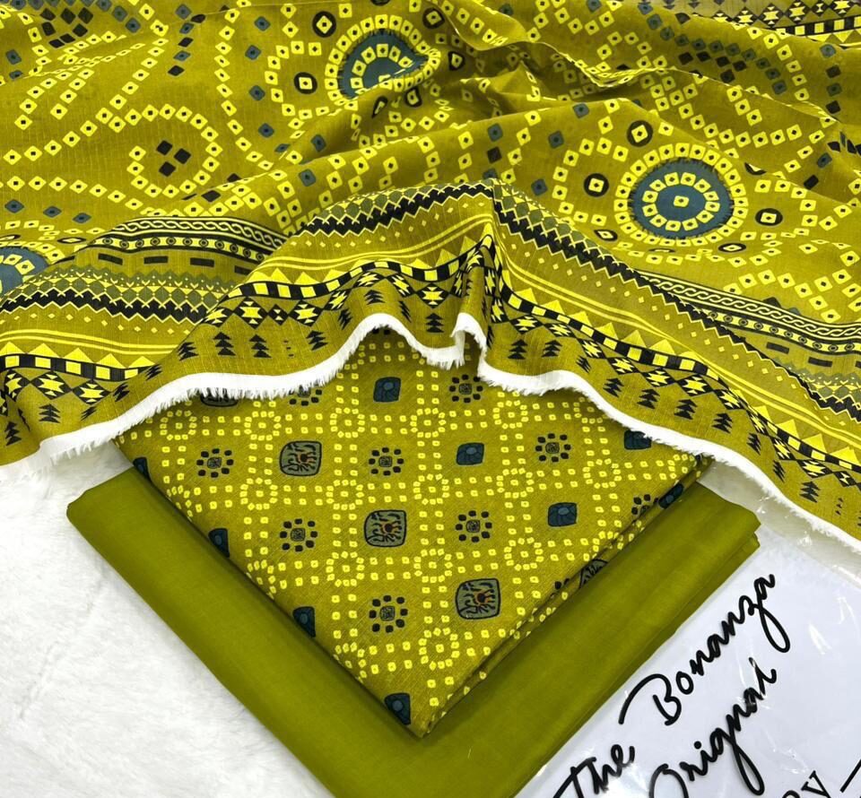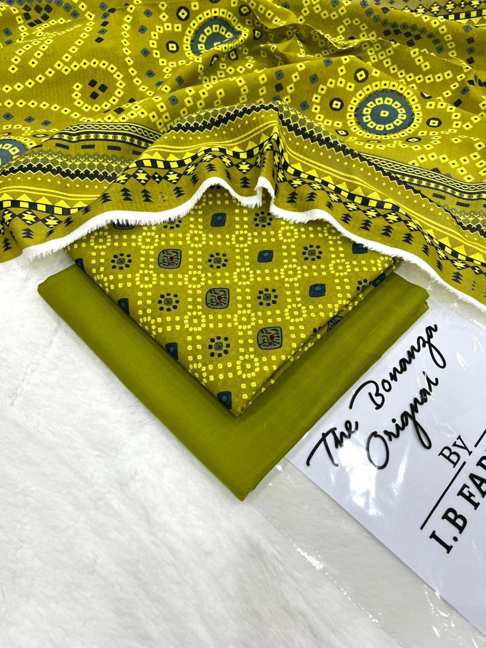 IB Print ka yeh stylish lawn suit un logon ke liye perfect hai jo unique aur modern prints pasand karti hain. Is outfit mein mustard aur olive shades ka khubsurat combination diya gaya hai, jismein geometric aur traditional patterns ka blend hai jo ek trendy aur eye-catching look create karta hai.