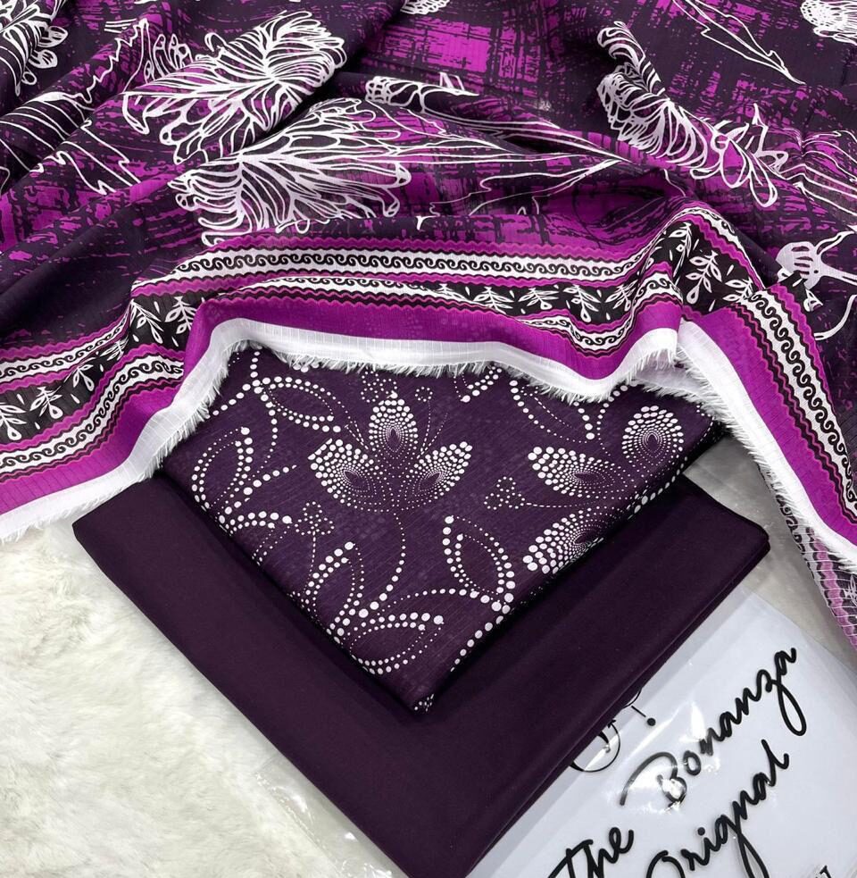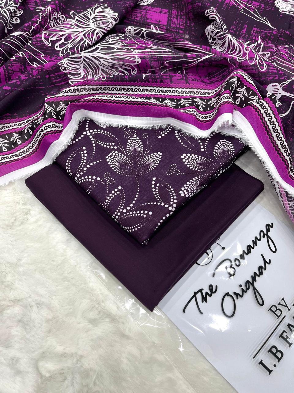 IB Print ka yeh modern aur elegant lawn suit un khawateen ke liye perfect hai jo unique aur trendy designs pasand karti hain. Is outfit mein purple aur magenta shades ka khubsurat combination diya gaya hai jo ek bold aur stylish look create karta hai. Shirt par abstract floral print isay contemporary touch deta hai, jabke dupatta ka detailed border overall outfit ko aur enhance karta hai.