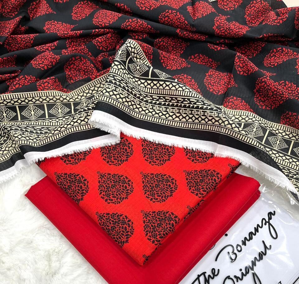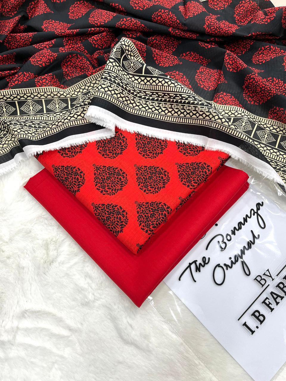 IB Print ka yeh premium lawn suit un khawateen ke liye perfect choice hai jo garmiyon mein comfortable aur stylish rehna chahti hain. Is suit mein vibrant red aur black floral print diya gaya hai jo ek bold aur graceful look create karta hai. Printed dupatta ke sath detailed border design is outfit ko aur bhi attractive banata hai.