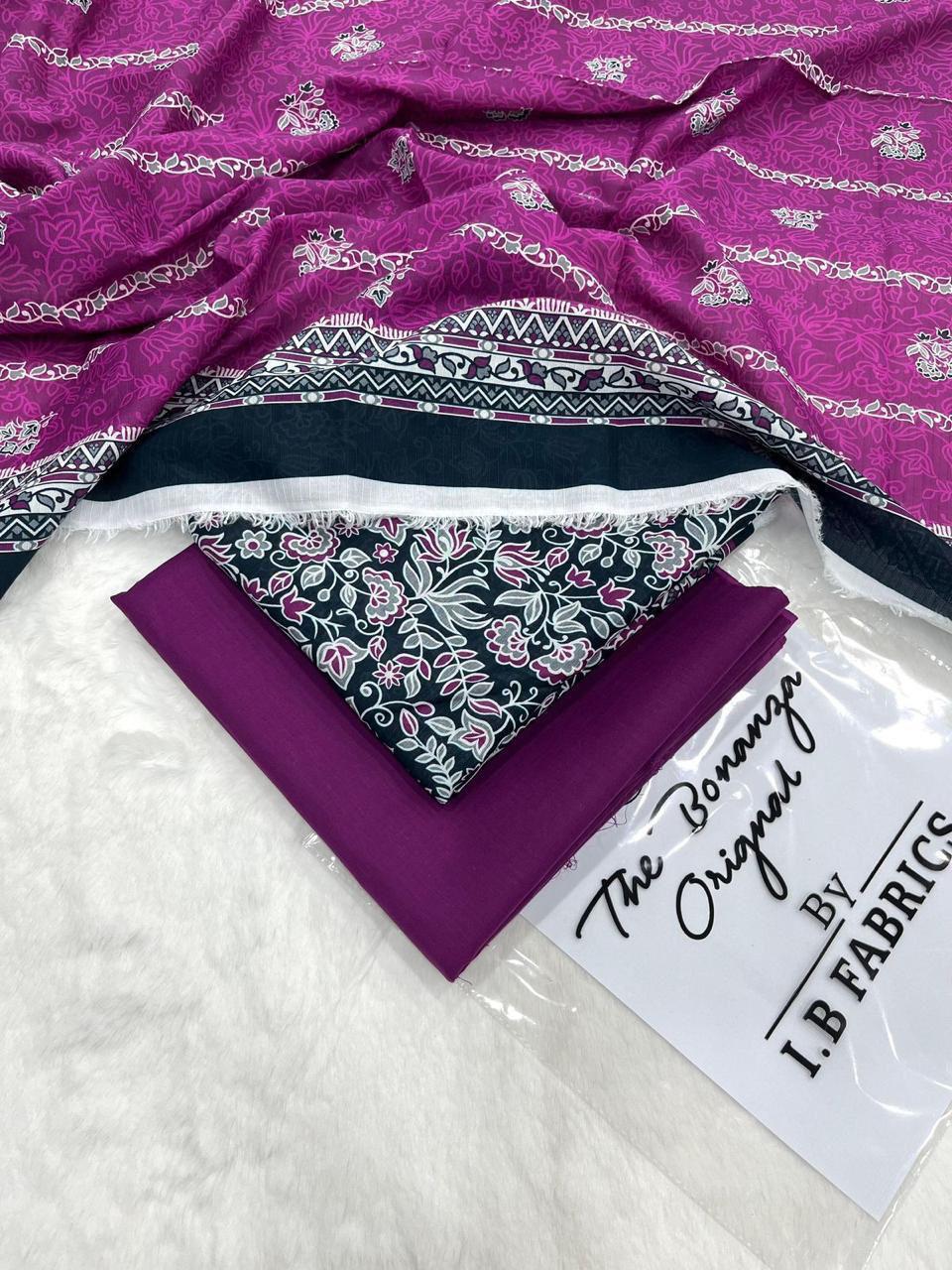 IB Print ki taraf se yeh magenta pink floral printed lawn suit un logon ke liye perfect hai jo bright colors aur elegant design pasand karte hain. Is outfit mein soft floral motifs ke sath subtle line pattern diya gaya hai jo ek graceful aur modern look create karta hai. Front panel par dark contrast aur detailed border is suit ko aur bhi stylish aur unique banata hai.