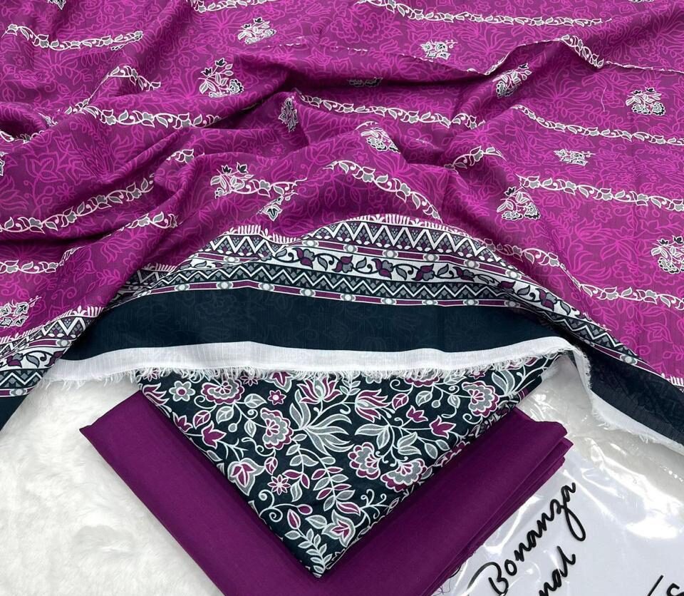 Yeh suit high-quality lawn fabric se tayar kiya gaya hai jo garmiyon ke liye best choice hai — lightweight, breathable aur comfortable. Din bhar pehnay mein asani aur freshness ka ehsaas deta hai. Is ke sath matching magenta trouser diya gaya hai jo poore outfit ko complete aur balanced look deta hai.