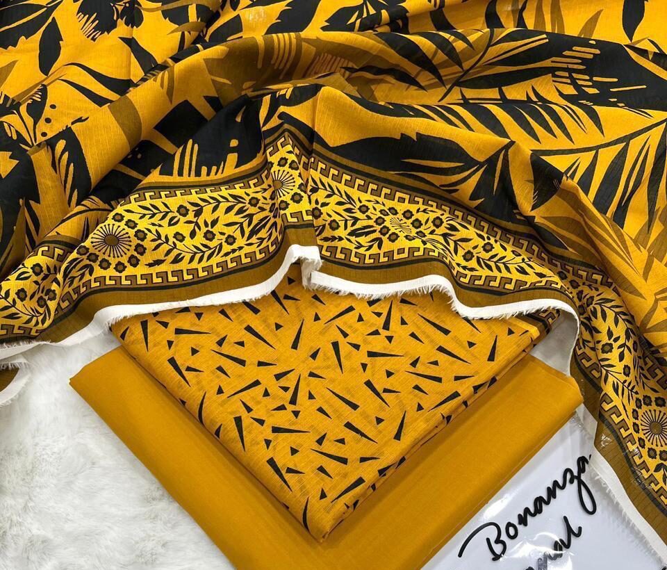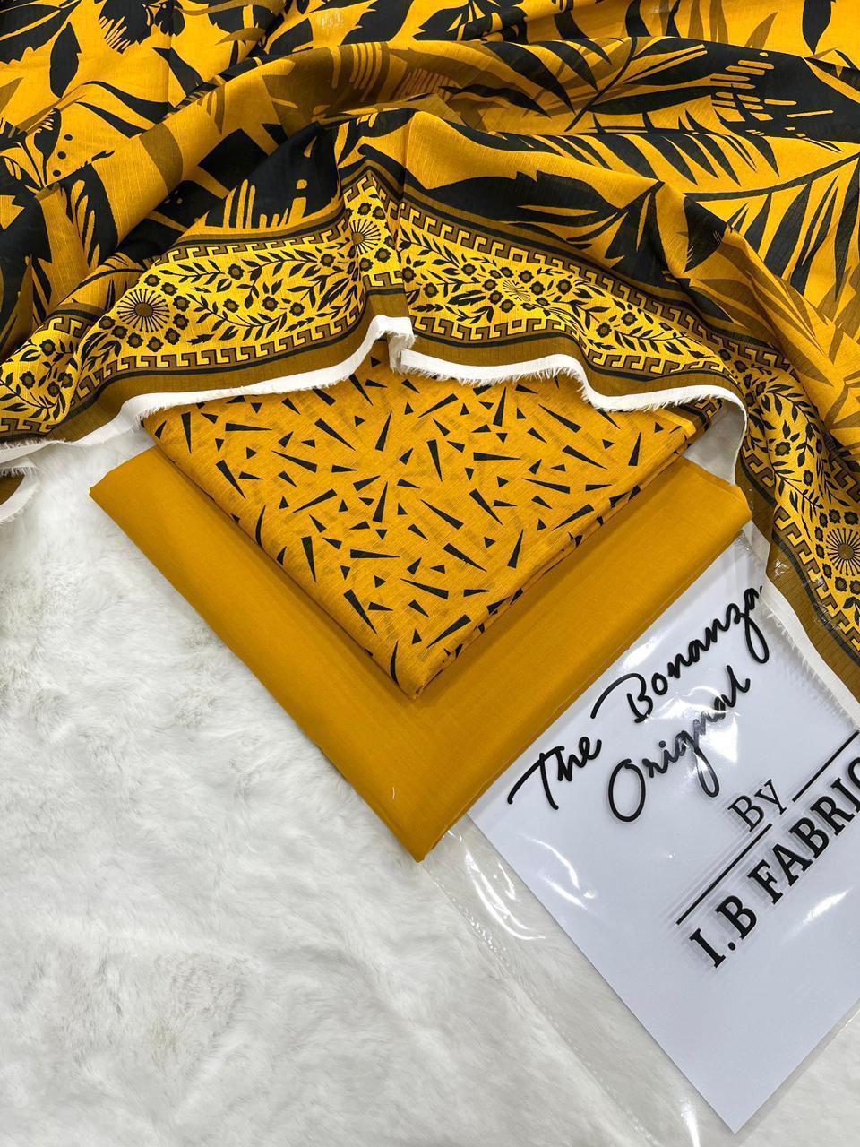 IB Print ki taraf se yeh mustard yellow aur black printed lawn suit ek bold aur trendy choice hai jo aap ke summer wardrobe ko instantly upgrade kar deta hai. Is design mein modern abstract aur leaf patterns ka unique combination use kiya gaya hai jo isay eye-catching aur fashionable banata hai. Shirt ke daman par diya gaya ethnic border is outfit ko ek traditional touch bhi deta hai.