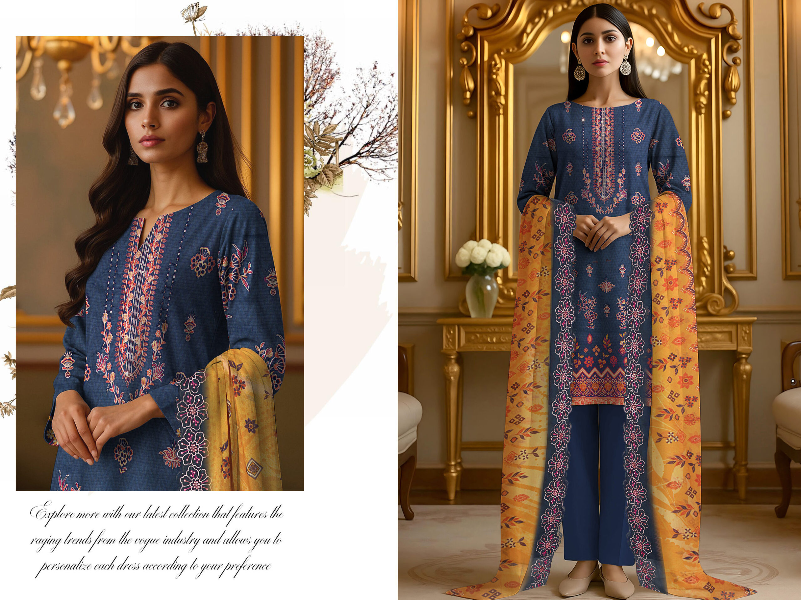 Is ke sath diya gaya mustard dupatta is dress ka sab se attractive hissa hai, jisme bold colors aur detailed prints use kiye gaye hain jo navy blue shirt ke sath perfect contrast create karte hain. Yeh dupatta aapke overall look ko zyada vibrant aur eye-catching banata hai.