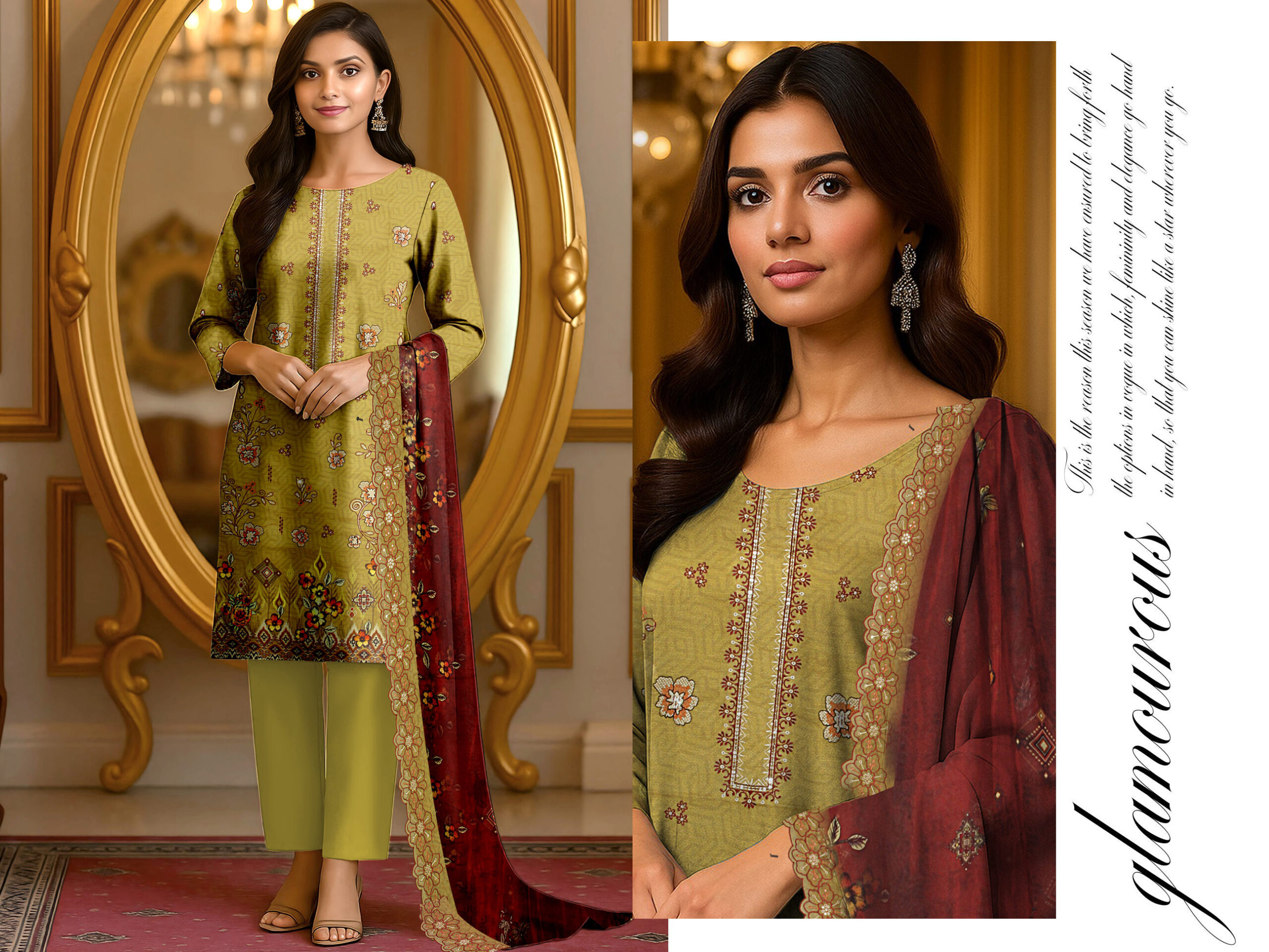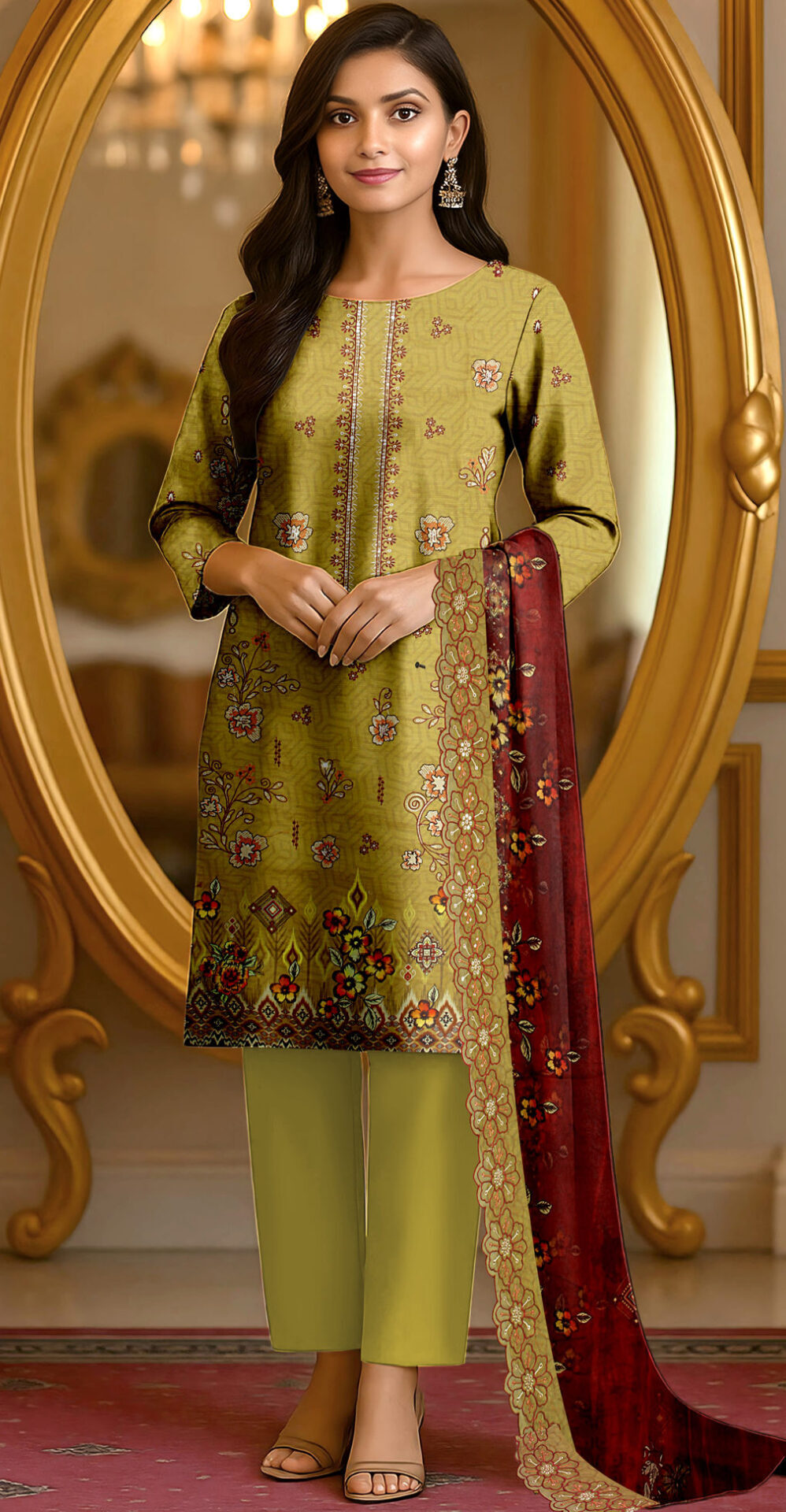 Is image mein model HT brand ka elegant olive green 3 piece suit pehne hue hai jo bohat sophisticated aur graceful look deta hai. Shirt par delicate floral aur traditional motifs ka khoobsurat print hai, khas tor par neckline aur daman par detailed design nazar aata hai. Is outfit ke sath maroon color ka contrasting dupatta diya gaya hai jisme intricate borders aur floral patterns hain jo overall look ko enhance karte hain. Matching olive green trouser outfit ko complete karta hai aur ek balanced aur classy appearance deta hai.