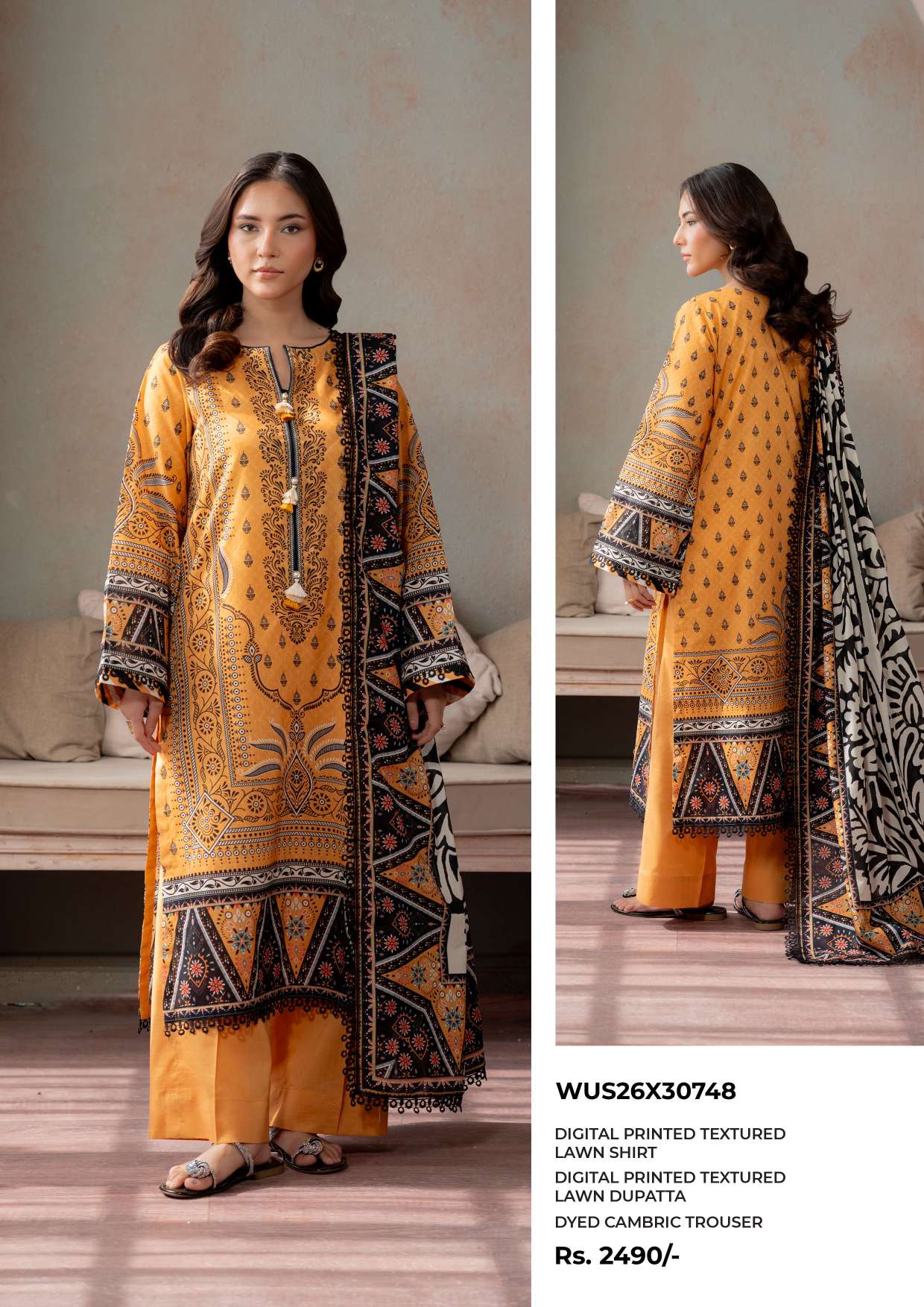 ZELLBURY ka yeh mustard yellow digital printed textured lawn suit un khawateen ke liye perfect hai jo vibrant colors aur traditional patterns pasand karti hain. Is 3 piece suit mein premium quality textured lawn shirt shamil hai jismein detailed ethnic prints aur bold borders use kiye gaye hain jo ek striking aur stylish look create karte hain.
