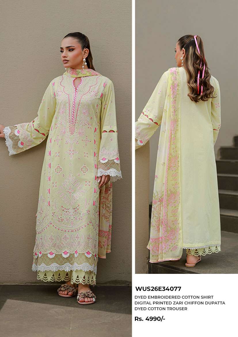 Iske sath dyed cotton trouser diya gaya hai jo relaxed fit aur all-day comfort provide karta hai. ZELLBURY ka yeh outfit casual wear, day events aur semi-formal gatherings ke liye ek ideal choice hai. Iska soothing color palette aur fine embroidery isay ek timeless aur elegant wardrobe essential banata hai jo aapki personality ko stylish tareeke se highlight karta hai.