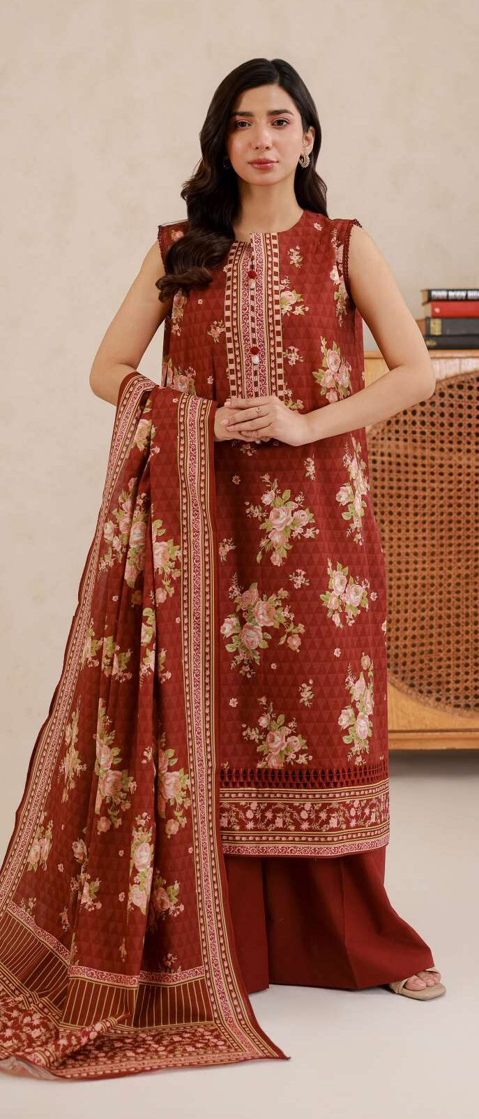 Is tasveer mein model ZELLBURY ka khoobsurat rust color ka 3-piece lawn suit pehne hue hai. Shirt par delicate floral print hai jo overall elegant aur classy look deta hai. Sleeveless shirt ke saath matching printed dupatta aur dyed cambric trouser perfect combination create karte hain. Outfit ko soft lighting aur minimal background ke sath showcase kiya gaya hai jo iski detailing ko highlight karta hai.